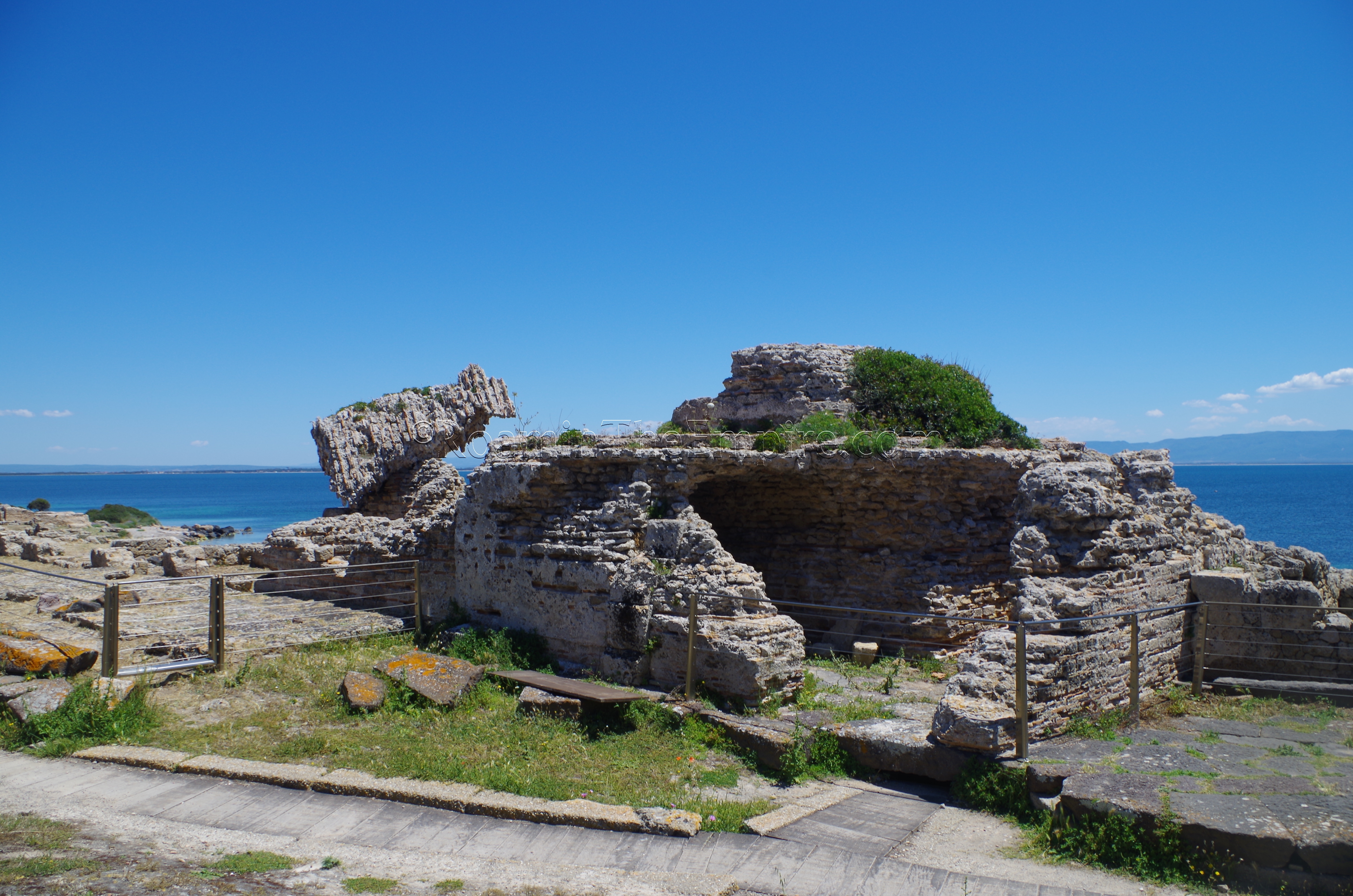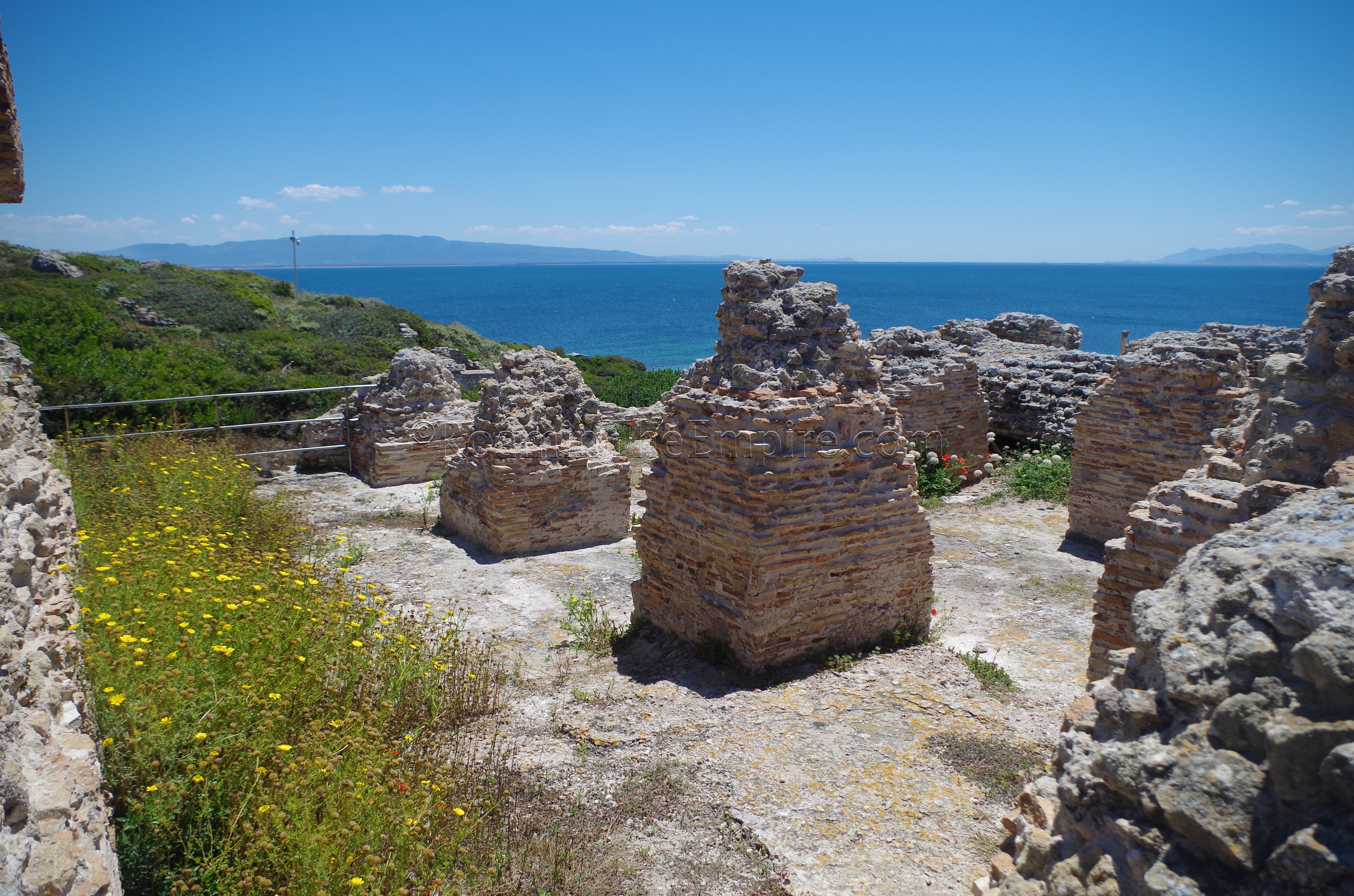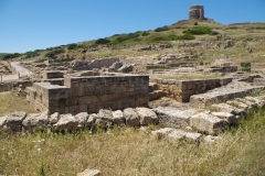 Like Nora, the visitor is prevented from walking among the remains in most areas and is limited to viewing from a few designated paths through the site; the Roman era roads in most cases. When entering and heading to the south (right), the structures to the right (west) side of the road are part of one of the residential districts of Tharros, sloping up the eastern side of the San Giovanni Hill toward the tower. Despite the houses being constructed during the Roman period of occupation, most of the houses are constructed in Punic style.