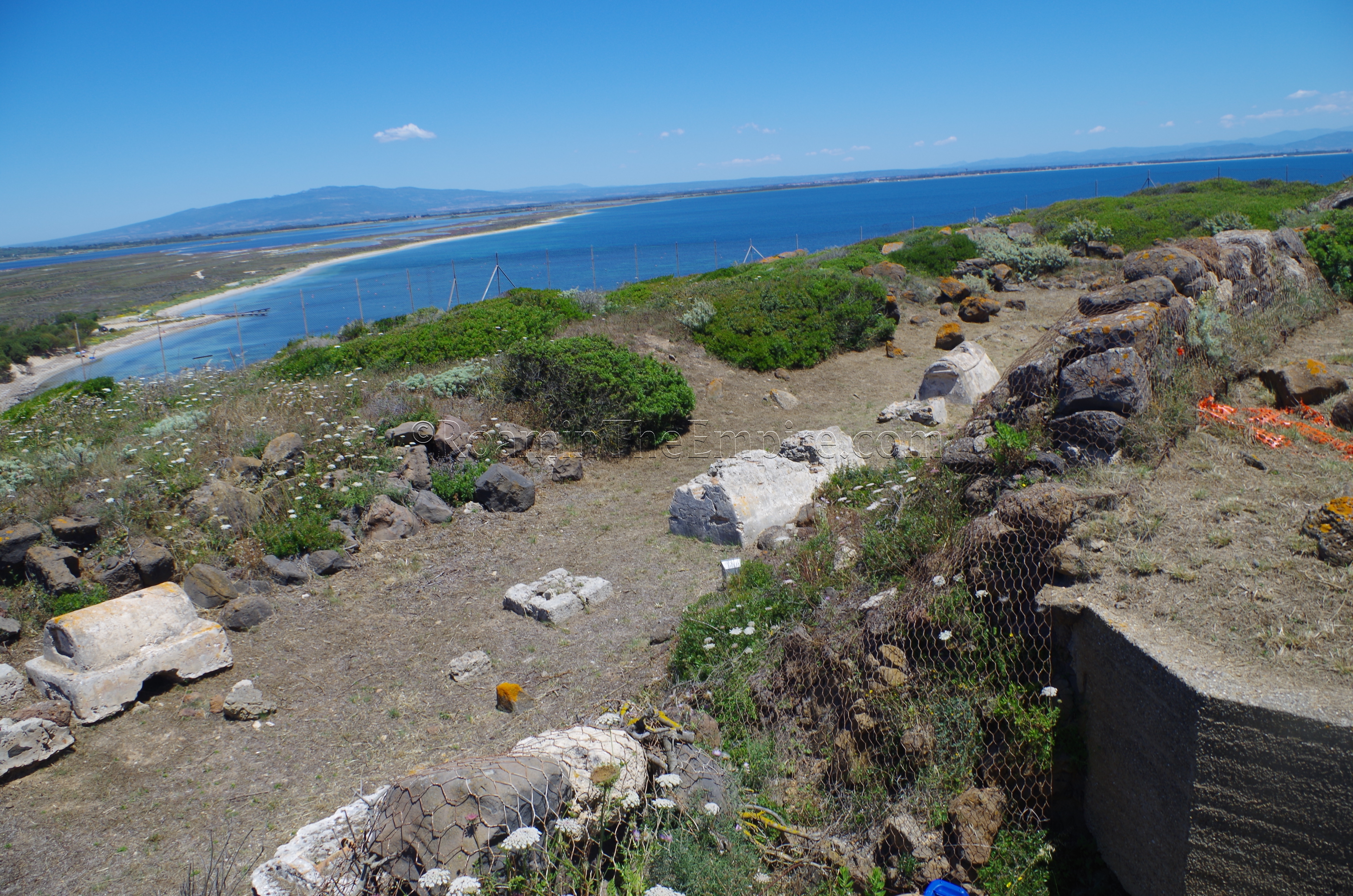 North of the Semetic Temple is the “Temple with Doric Columns” as it is known. As with many of the other temples at Tharros, this one too seems to have been preceded by a Punic area of worship. The first incarnation of this sanctuary dates back to the founding of the Phoenician colony, and was little more than a rocky outcropping decorated with offering niches. In the 4th or 3rd century BCE, a temple composed primarily of sandstone blocks was built upon the rocky outcropping. Finally, after the Roman occupation, the Punic temple was destroyed and a Roman style temple was built, with the podium being constructed, in part, with blocks from the Punic temple. Sandstone blocks with carved Doric columns and Aeolian-Cypriot capitals are, in particular, remnants of the Punic temple. The deity to which any of the phases of temples were dedicated to is unknown.