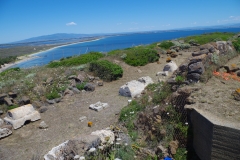This completes a loop of the main settlement of Tharros, and one can head up the cardo maximus to the Su Muru Mannu area. There is not much excavated on either side of the cardo maximus when heading up the hill, though a significant amount of paving is intact with wood paneling covering the sewer down the center. Just past where the pavement ends, on the right (east) side is the Temple of Demeter. The temple is very fragmentary with just a few sections of remains still standing. These remains date to the Roman period, but there was a temple at this location, also likely to Demeter, in the late Punic period.