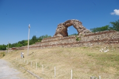 About 170 meters on from this first gate in the southern walls, is the second and primary southern gate. This gate, the so-called ‘Camel Gate’ is one of the most recognizable features of the ancient city. It gets its name from the two projections atop the gate, remnants of an upper arch, which now resemble the humps of a camel. The construction of this gate does not date to the original late 3rd century CE construction of the walls, but rather to a late 4th century phase of construction that was concerned with repairs to the existing wall and also included the construction of this new gate. Its structure is more elaborate than the other gates, certainly when compared to the mostly intact western gate. The presence of the additional arch atop the entrance seems to indicate some kind of defensive tower structure. The entry is much wider than the other gates and niches are present for the display of statues. The road emanating from this gate continued on toward Philippopolis (Plovdiv). There is a nearby sign with information in Bulgarian, Russian, English, and German.