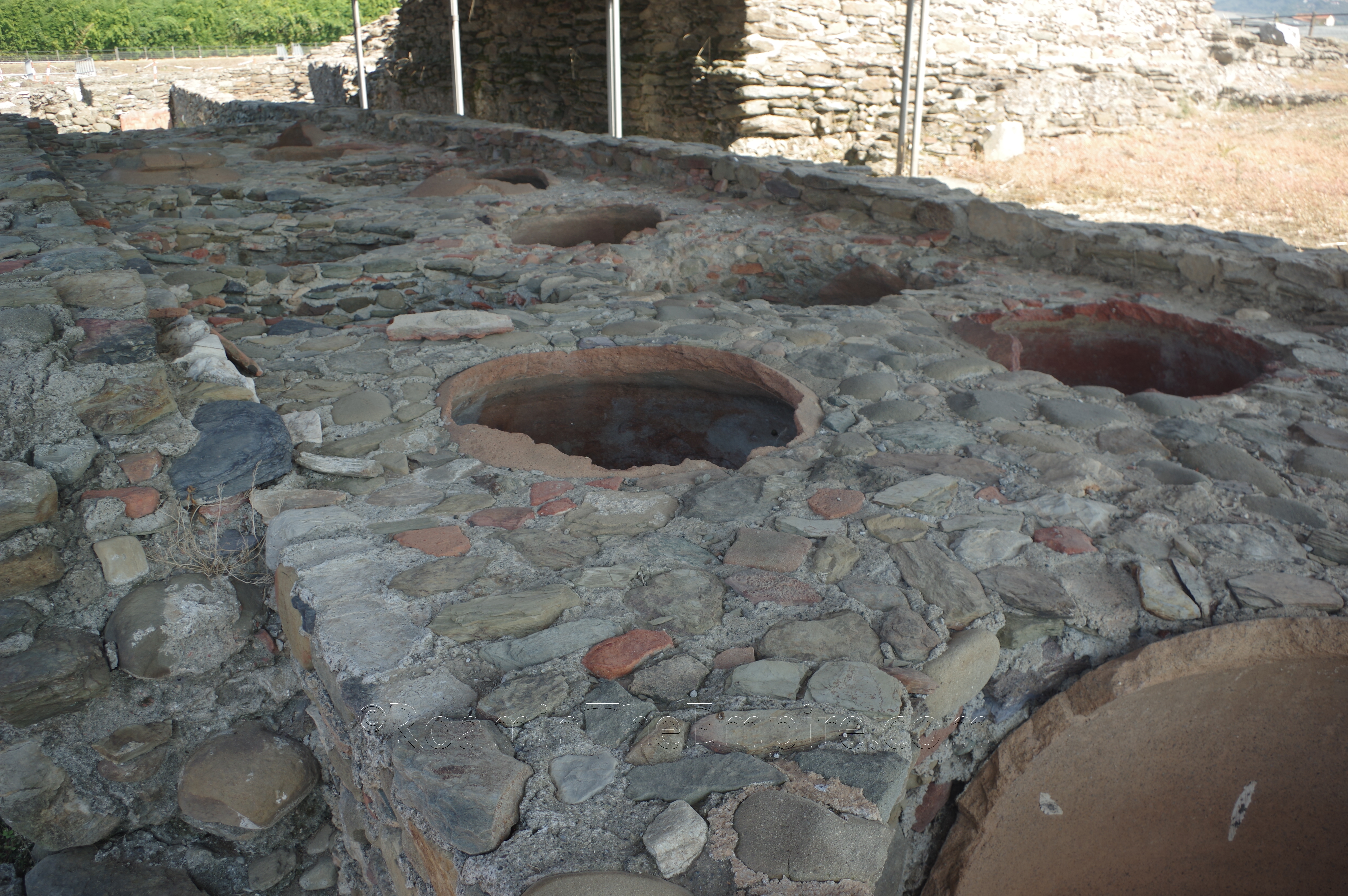 Around the north side of the house is a complex identified as a temple, possibly being dedicated to Diana. The identification comes from the discovery of a relief depicting the goddess, though the attribution is by no means secure. The temple was built in the middle of the 1st century CE, when a large artificial terrace was constructed over the previously existing buildings. Just a small bit of the foundations of the temple are visible, with much of the excavated are of the temple being backfilled. Between the temple and the Domus degli Affreschi, though, below the terrace, is an interesting room filled with a number of dolia defossa preserved in the floor. This room appears to have been associated with the temple complex rather than the house.