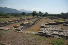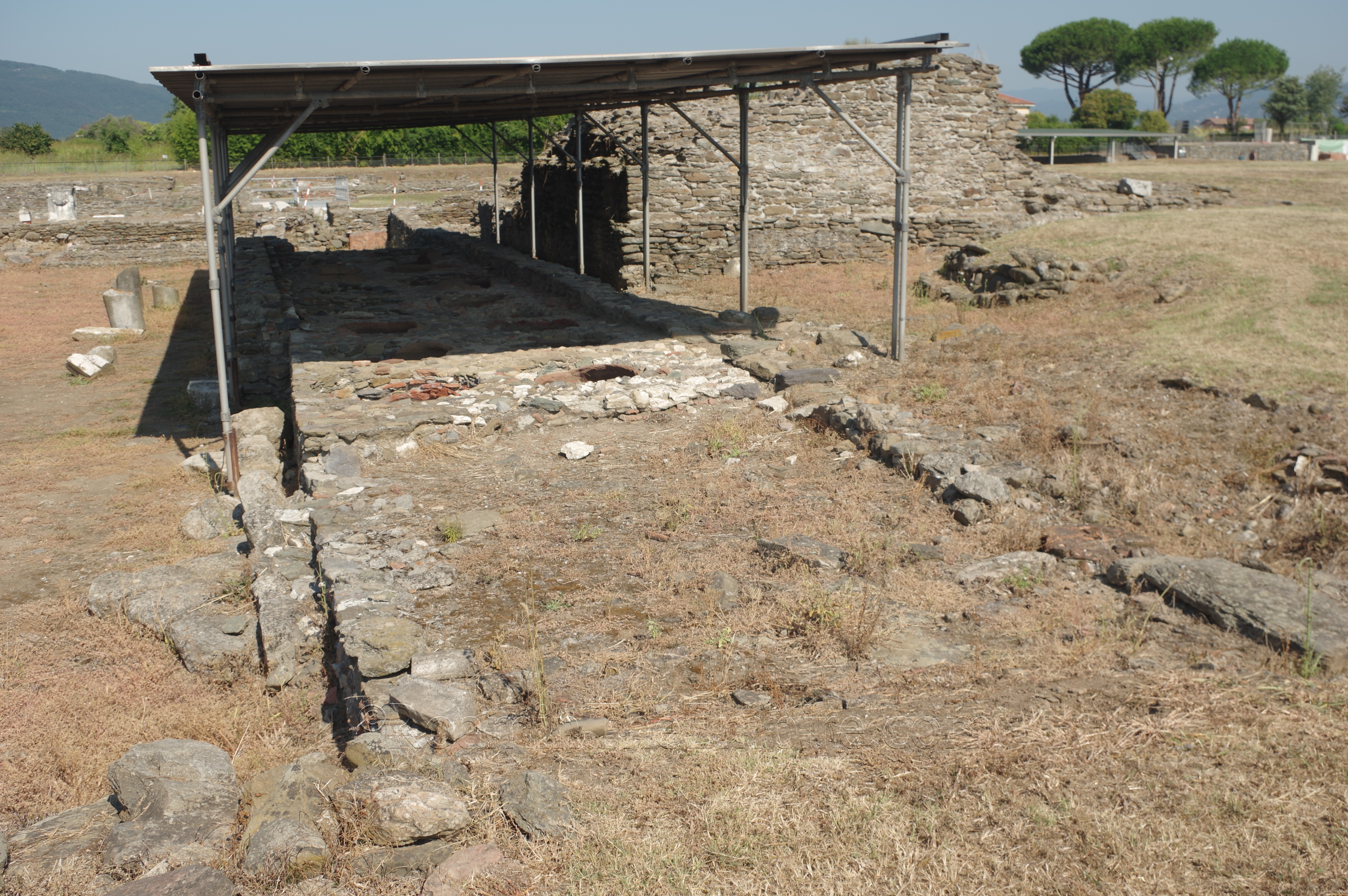 The first accessible structure that the path to the north leads to is the Domus Settentrionale, the Northern House. This home was constructed in the early imperial period, overlaying unspecified buildings of the Republican age. It was situated near the northern gate of Luna. It was abandoned in the 4th century CE, but in the early medieval period a series of four burials were made in the structure. Unfortunately only a few bits of the Domus Settentironale are visible. The ancient house is overlaid by a modern structure, which appears to have the house excavated within the structure, but not accessible. The epigraphic exhibition also seems like it is, or was, housed in this building but is similarly no longer accessible.
