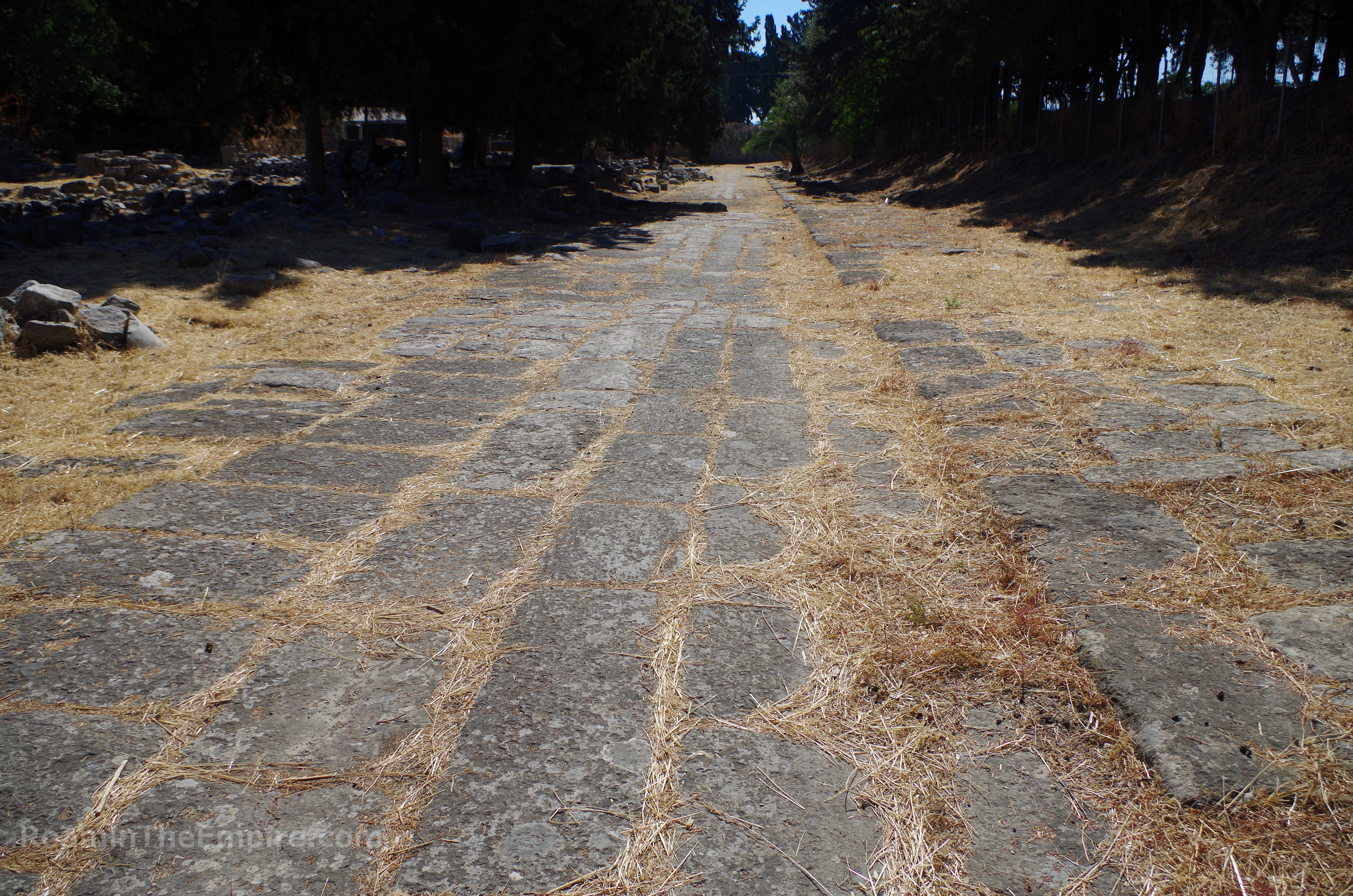 Running along pretty much the entire eastern side of the bathing complex (as well as beyond to the south) is a cardo with intact paving stones. The semita is also pretty clearly defined for a large stretch of the road as well. This road ran north to the stadium and perhaps all the way to the port. On the east side of the road, opposite about the point of the original frigidarium and tepidarium of the baths is a building with partial modern reconstruction. This area was originally identified as a nymphaeum, but in reality it was a lavishly decorated public latrine. It was constructed as part of the post-142 CE earthquake building phase of the baths. Unfortunately there is no direct access, there is a locked gate at the entrance, but the interior is somewhat visible through the gate. There’s a colonnaded courtyard type area with mosaic flooring. The water channels seem to be somewhat visible along the exterior walls, but it is hard to tell.