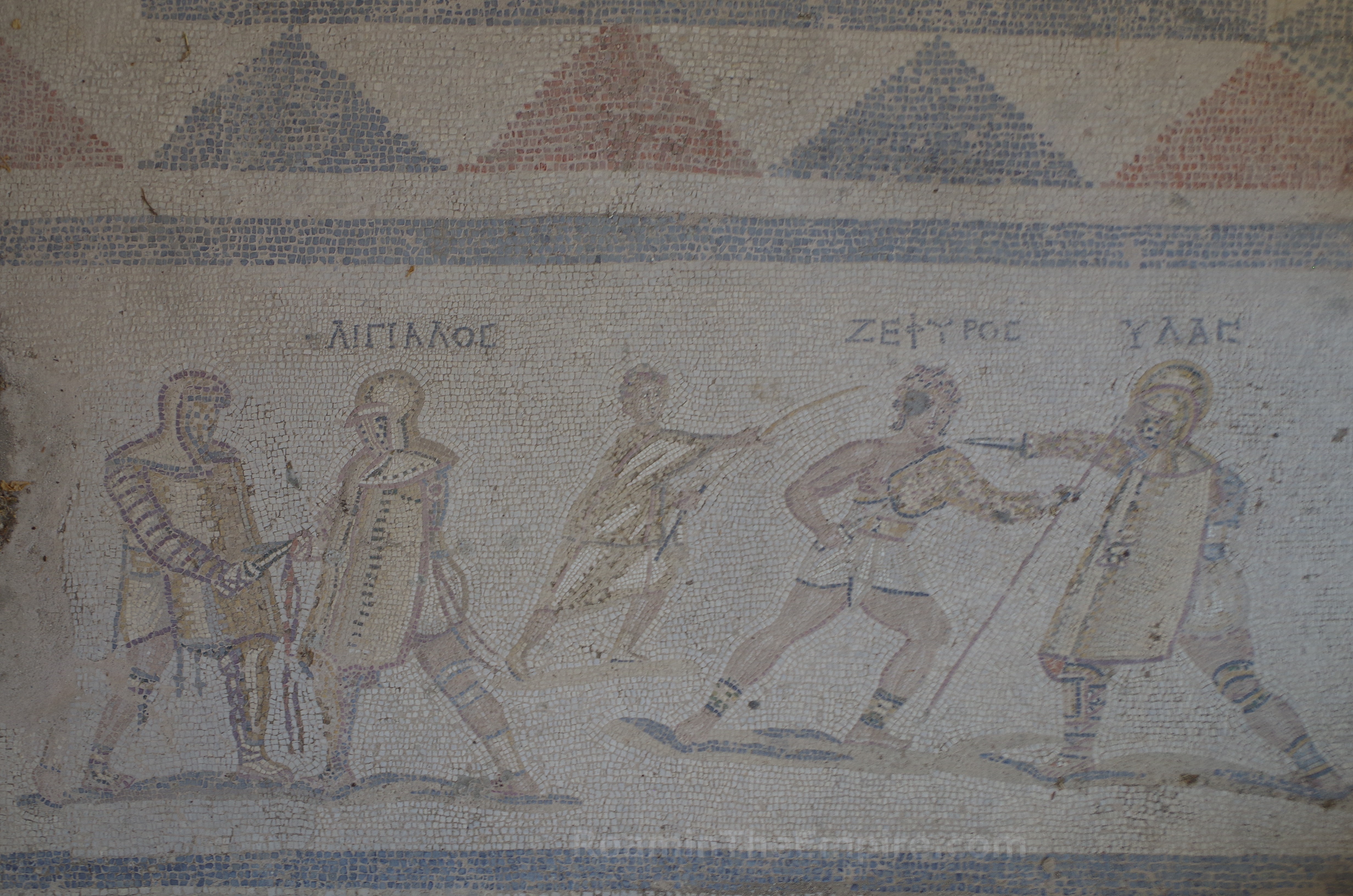 The mosaic was located on the north side of a private residence constructed here sometime during the Roman period. The mosaic itself dates to the 2nd century CE. It was built on the foundations of a previous building of indeterminate use that dated to the 4th-3rd century BCE. Not much remains of the rest of the residential structure, though. There are a few bits of mosaic in the area to the south of the Judgement of Paris mosaic from other rooms in this house, the southern part of which was later built over by the bathing complex to the south.