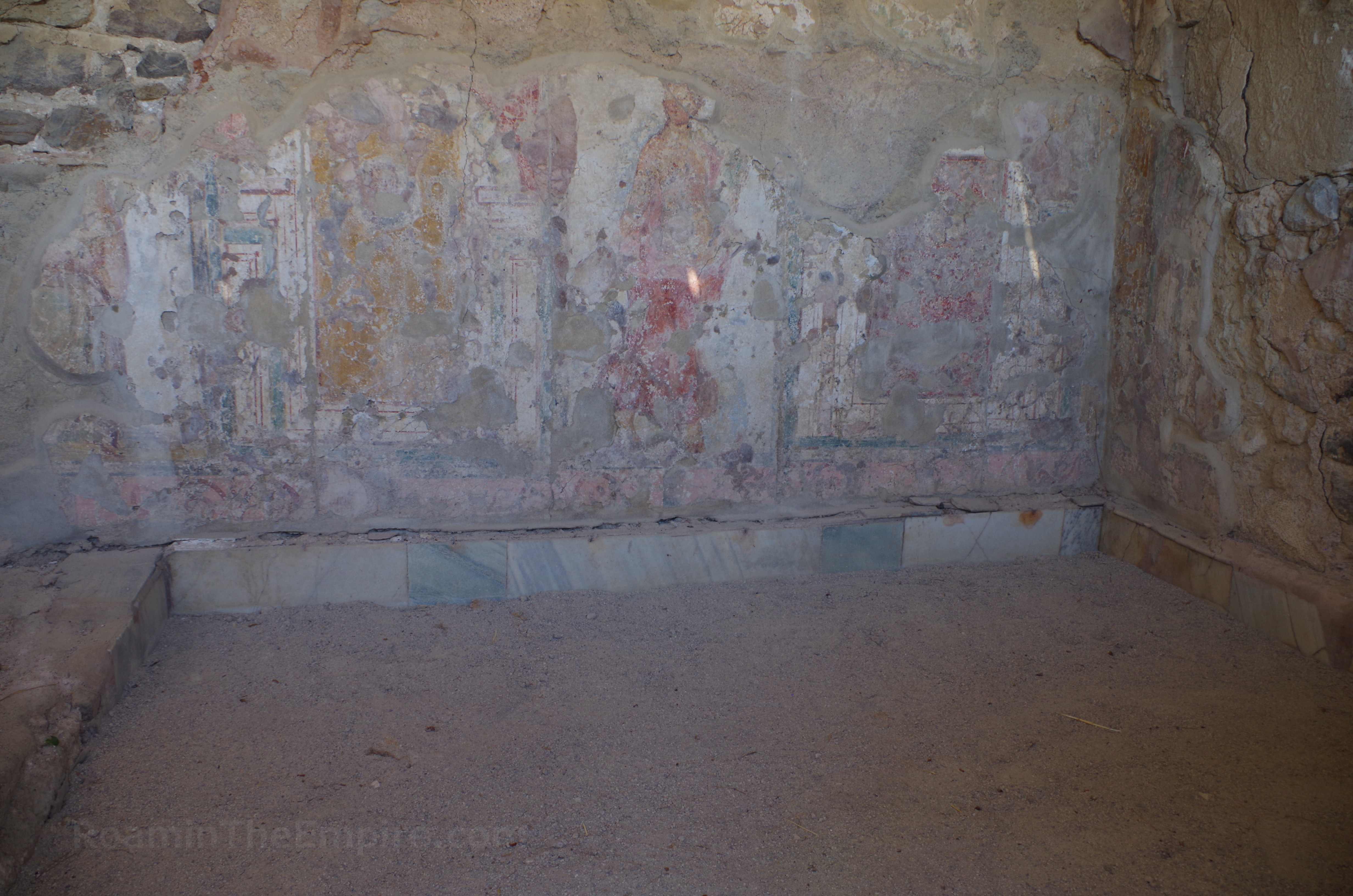 Southeast of the House of Europa is the House of Silenus. This house also gets its name from one of the mosaics that adorns a room beneath the protective roof. Fortunately, this mosaic wasn’t covered over. The scene of Silenus riding on the back of a mule is only one small panel on the mosaic. Beneath him are scenes of gladiatorial combat, with mosaicked inscriptions of some of the participants’ names. On the opposite side of the Silenus panel, separated by a well head and oriented in the opposite direction, is a corresponding panel depicting Meleager hunting the Calydonian Boar. Another room has a smaller mosaic of a vessel as well as some fresco wall decoration. North of this house (and east of the House of Europa) is what appears to be another house, but aside from one small section of wall painting under a small protective covering, there’s no real distinguishing features, and it doesn’t seem to have a particular name like the other two.