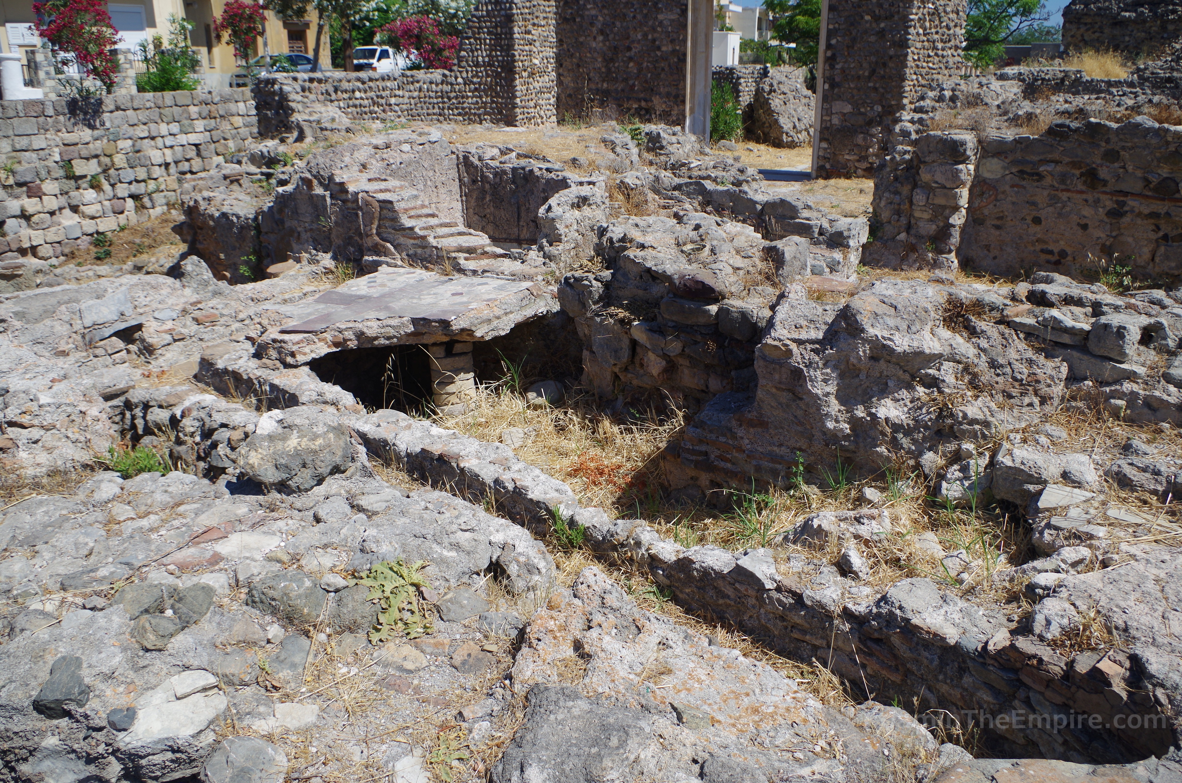 Beyond the caldarium was the smaller bathing complex added after the 2nd century CE earthquake. This area was also heavily modified by the later Christian church. A large intact/reconstructed doorway belonged to the church, as well as a baptistry in what would have been the frigidarium of this bathing area. Some remnants of mosaics dating to the church are also scattered around this area. The marble flooring in the area is probably also associated with the later church, and some pieces with Greek inscriptions are among those used. West of the frigidarium (which was located directly south of the prafurnia) were the tepidarium on the north side and caldarium on the south side. Elements of marble flooring and a hypocaust system can be seen in the remnants of these rooms.