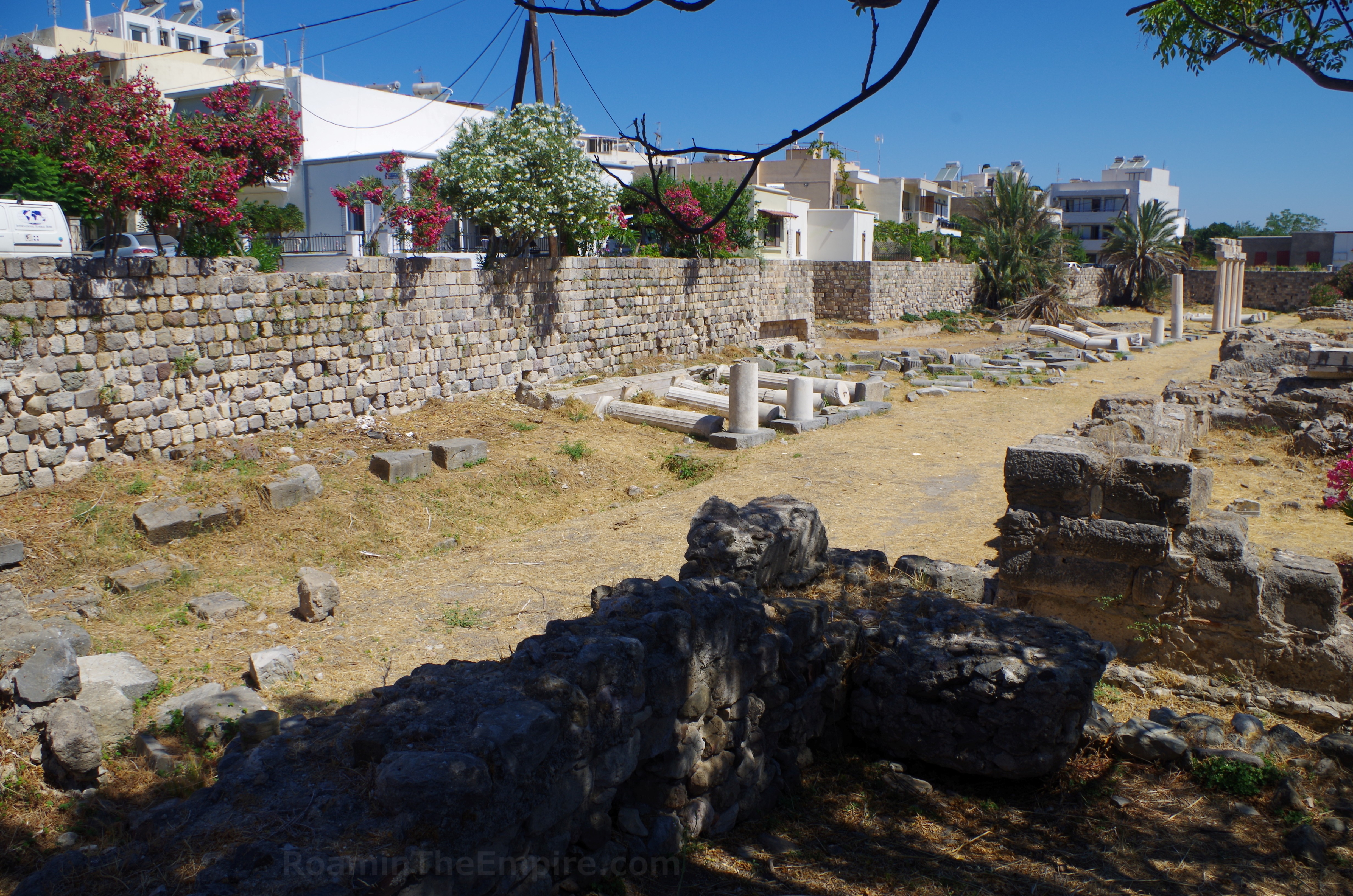 Just to the south of the stadium, on the south side of Panagi Tsaldari, is the Western Archaeological Zone (Δυτικός Αρχαιολογικός Χώρος) of Kos. There is an entrance to this area right at the corner where Panagi Tsaldari goes from a north-south street to an east-west street. The Western Archaeological Zone has seemingly flexible hours that very from year to year and season to season. The minimum opening time will be from 8:00 or 8:30 to 15:30 every day except Tuesday, when it is closed. In the summer, it could sometimes be open as late as 20:00. That was the posted time when I visited, but I have seen others report it could also be 15:30 at peak summer dates. Access is controlled with fences and gates, but not monitored and there is no entrance ticket for the site. There is also an entrance at the south side at Leoforos Grigoriou V.