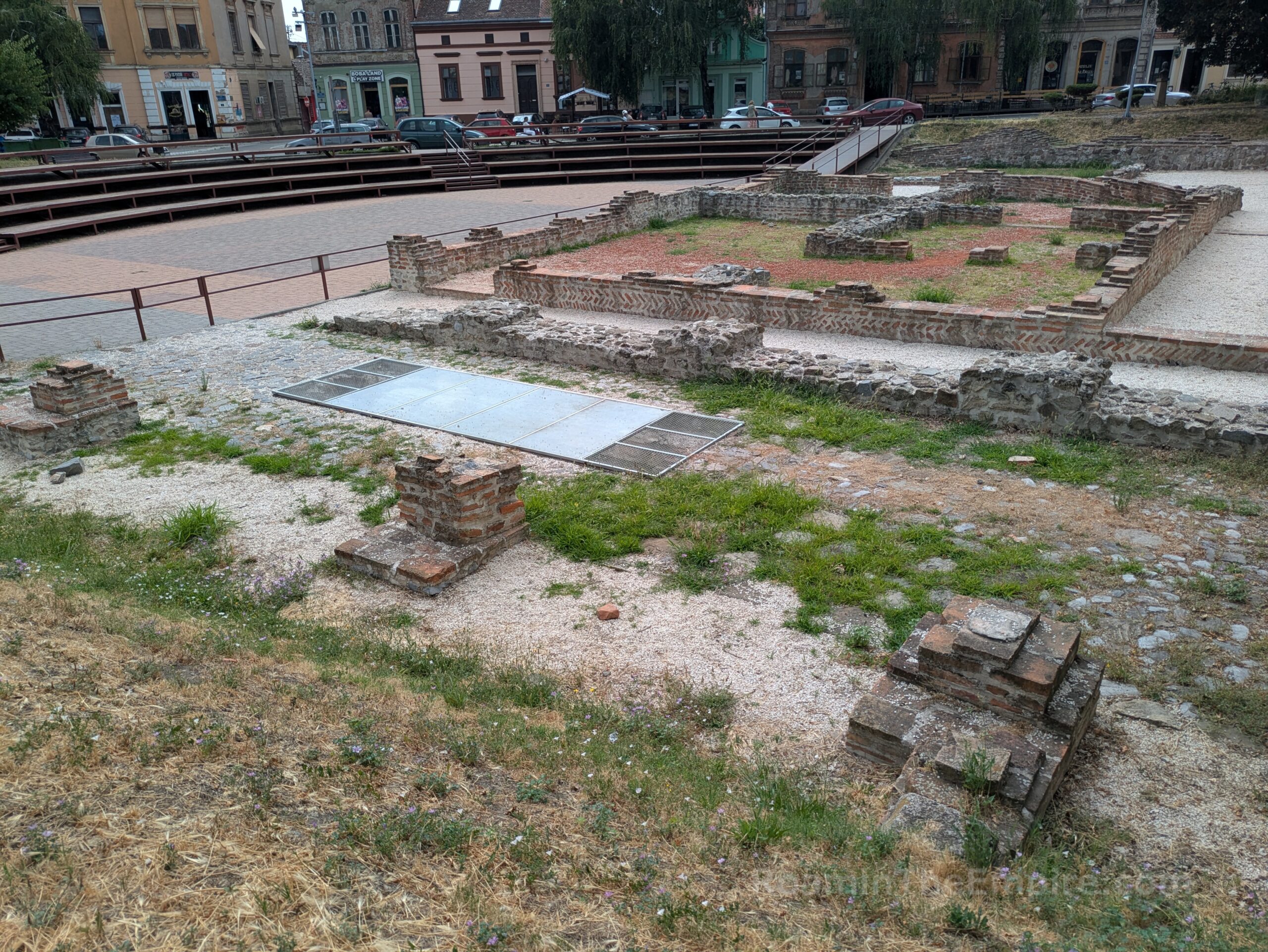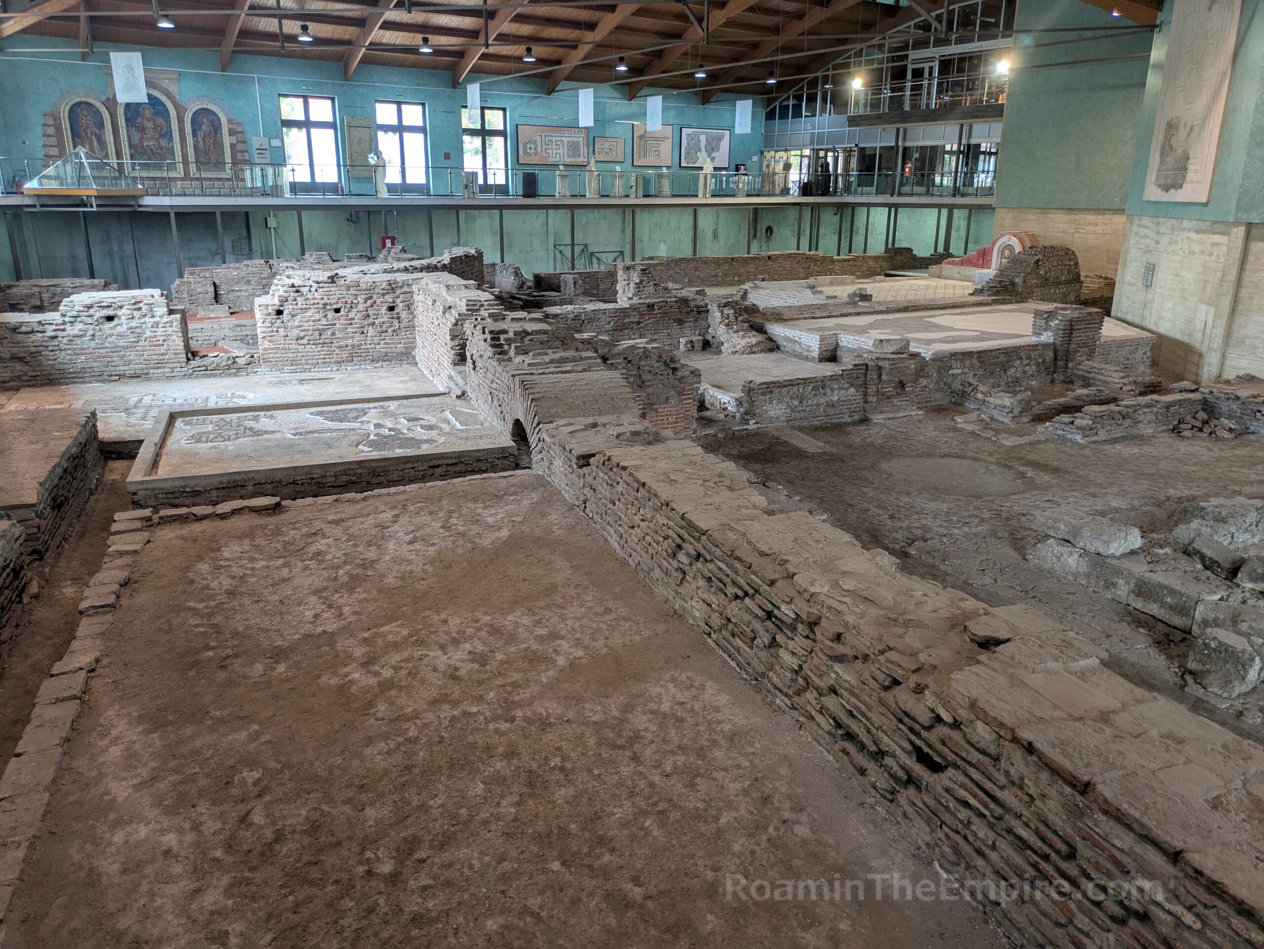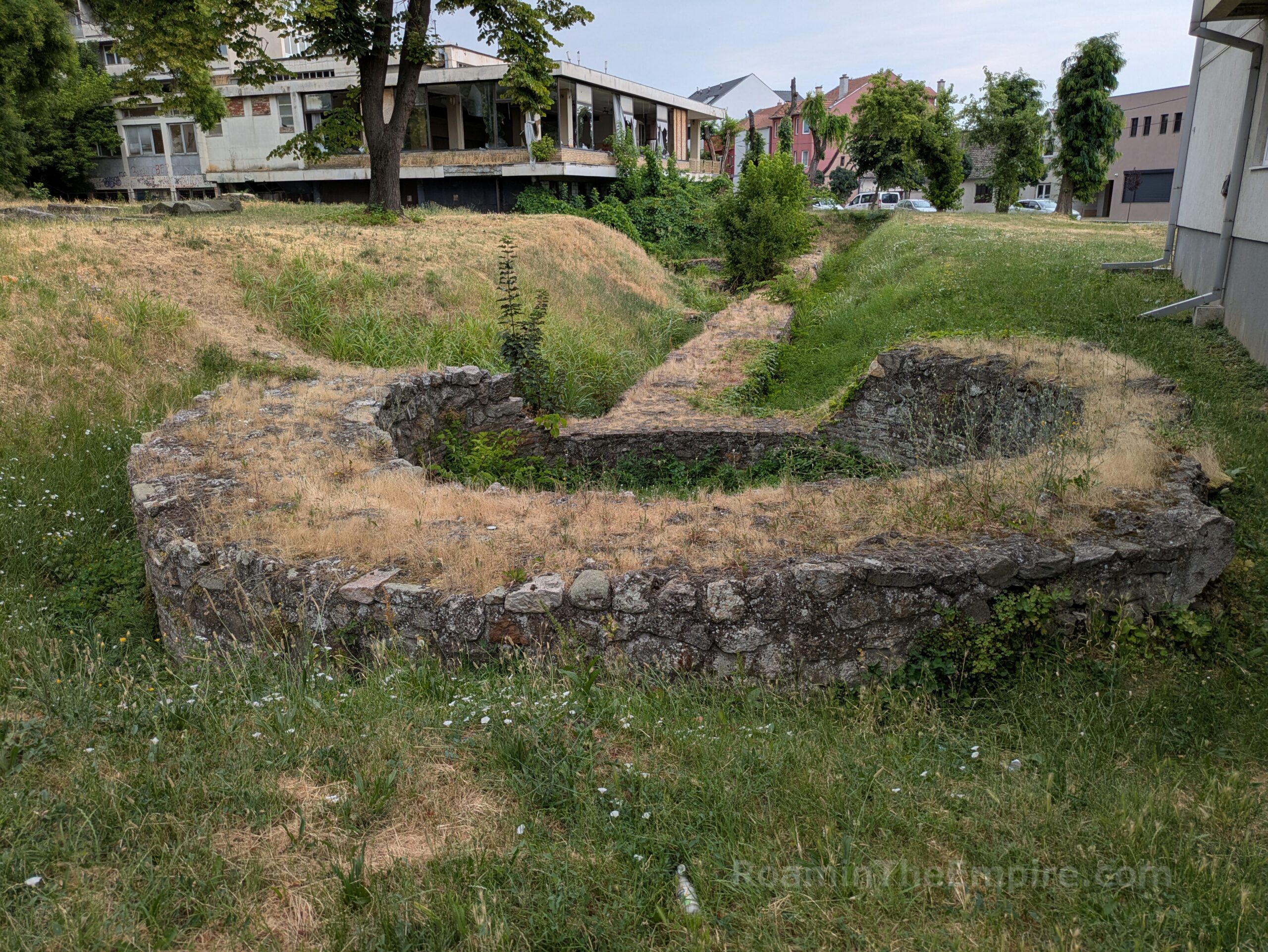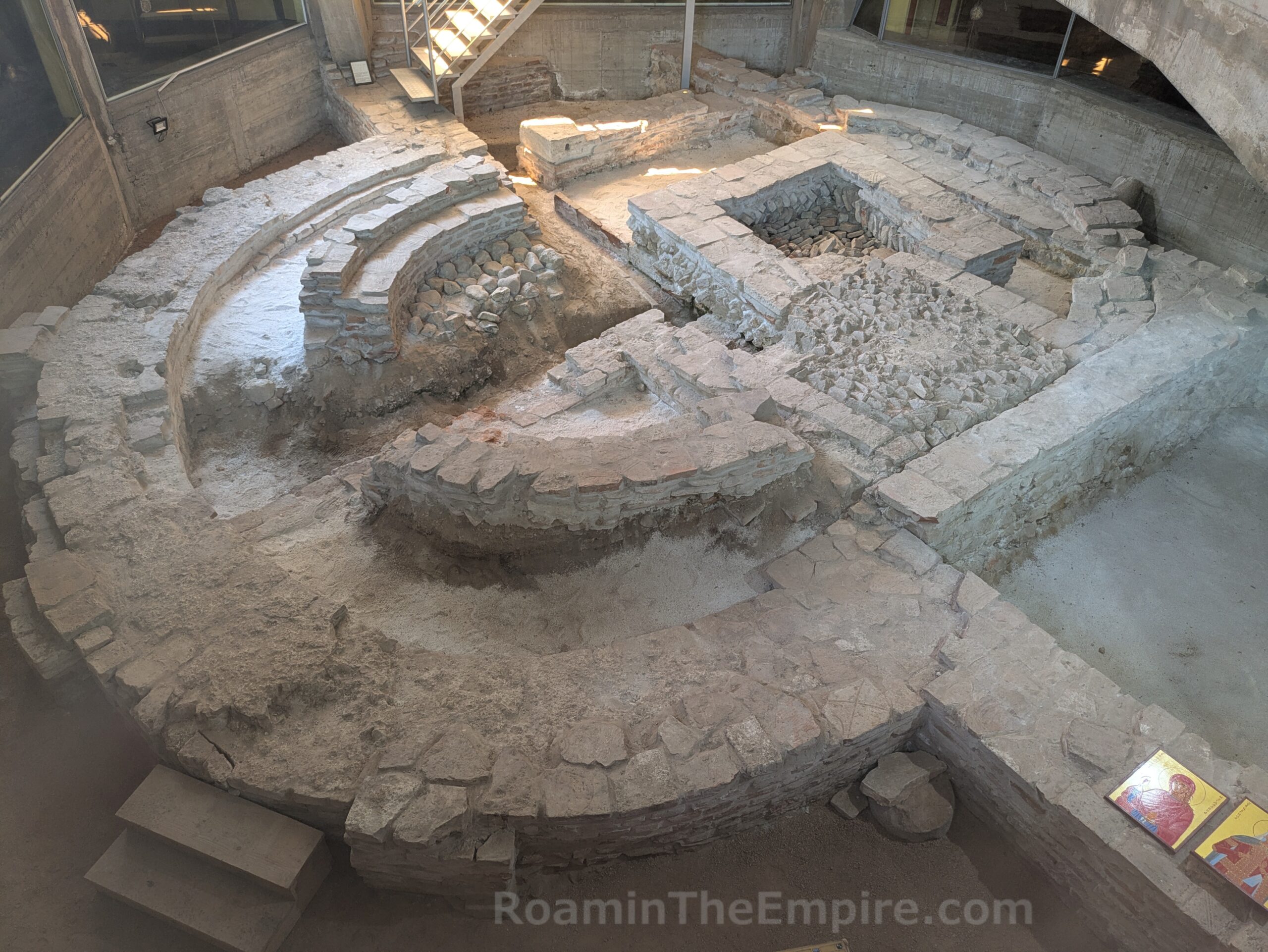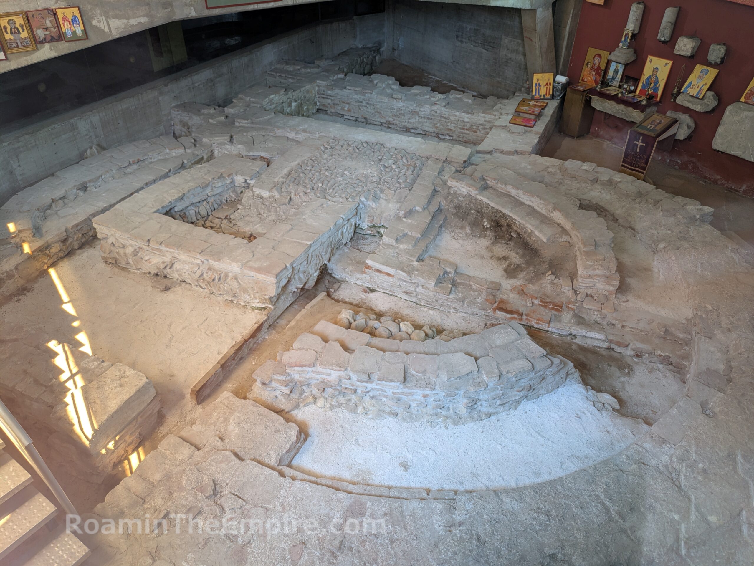 Sremska Mitrovica readily embraces its ancient heritage, with a number of businesses incorporating the ancient name, including the city bus service. Though many remnants of the ancient city have been found, only a few can be visited. When approaching the historic center of Sremska Mitrovica by foot from the train or bus station, the first vestige of the ancient city are the remains of the 5th century CE Basilica of St. Demitrius. The remains of the Christian basilica are tucked beneath a building off the west side of Trg Vojvođanskih Brigada. Unfortunately, it seems to have very limited hours of operation. It’s an active religious site that only seems to be accessible on Sunday from around 17:30 to 16:00. There are large glass windows at street level, though, and it can be seen pretty well even when there is no direct access. The basilica was built between 426 CE and 441 CE. The more robust semicircle wall of the apse and a small portion of an adjacent wall are all that remain from the original building, with the other constructions being from later iterations of the church.