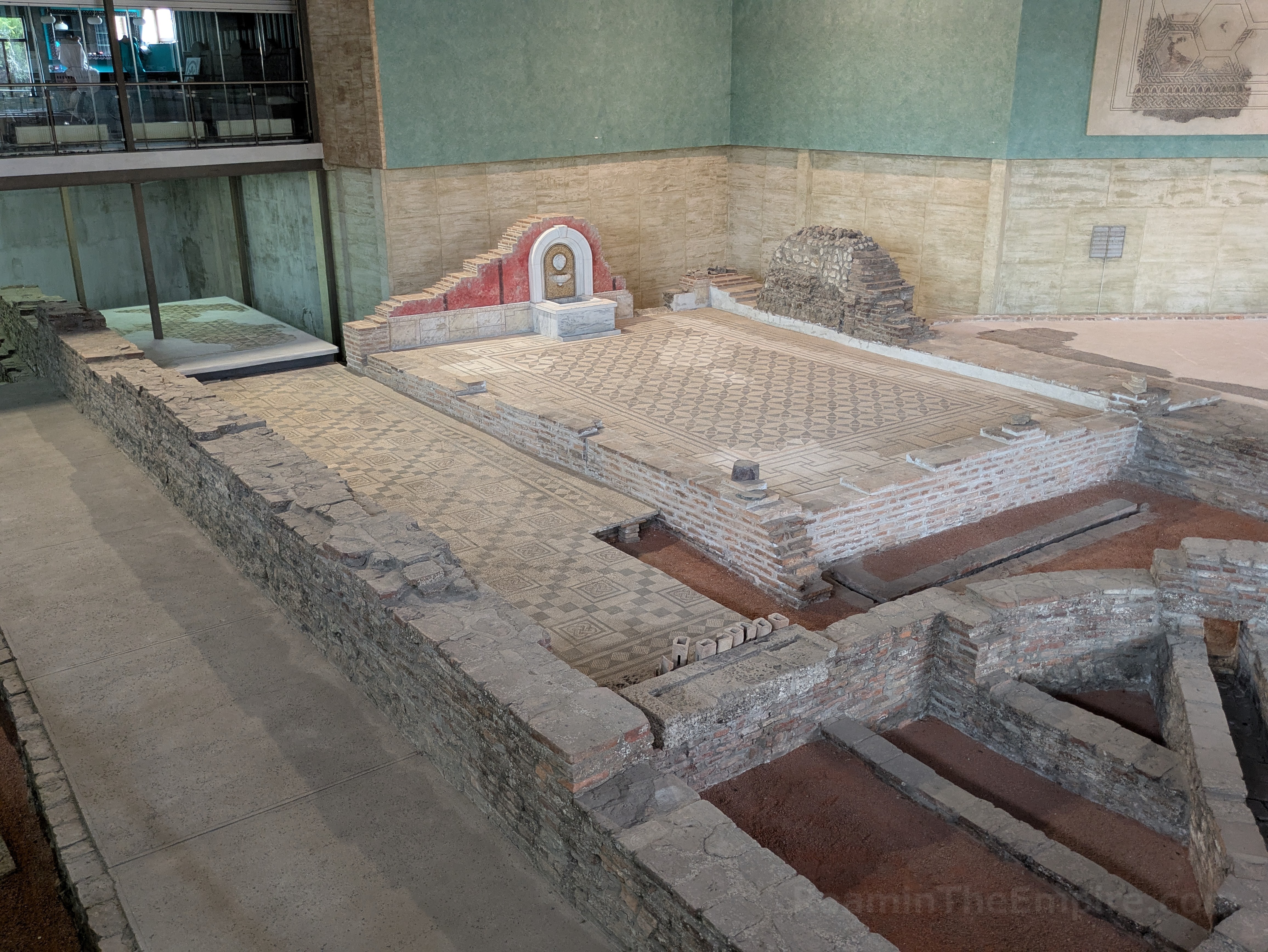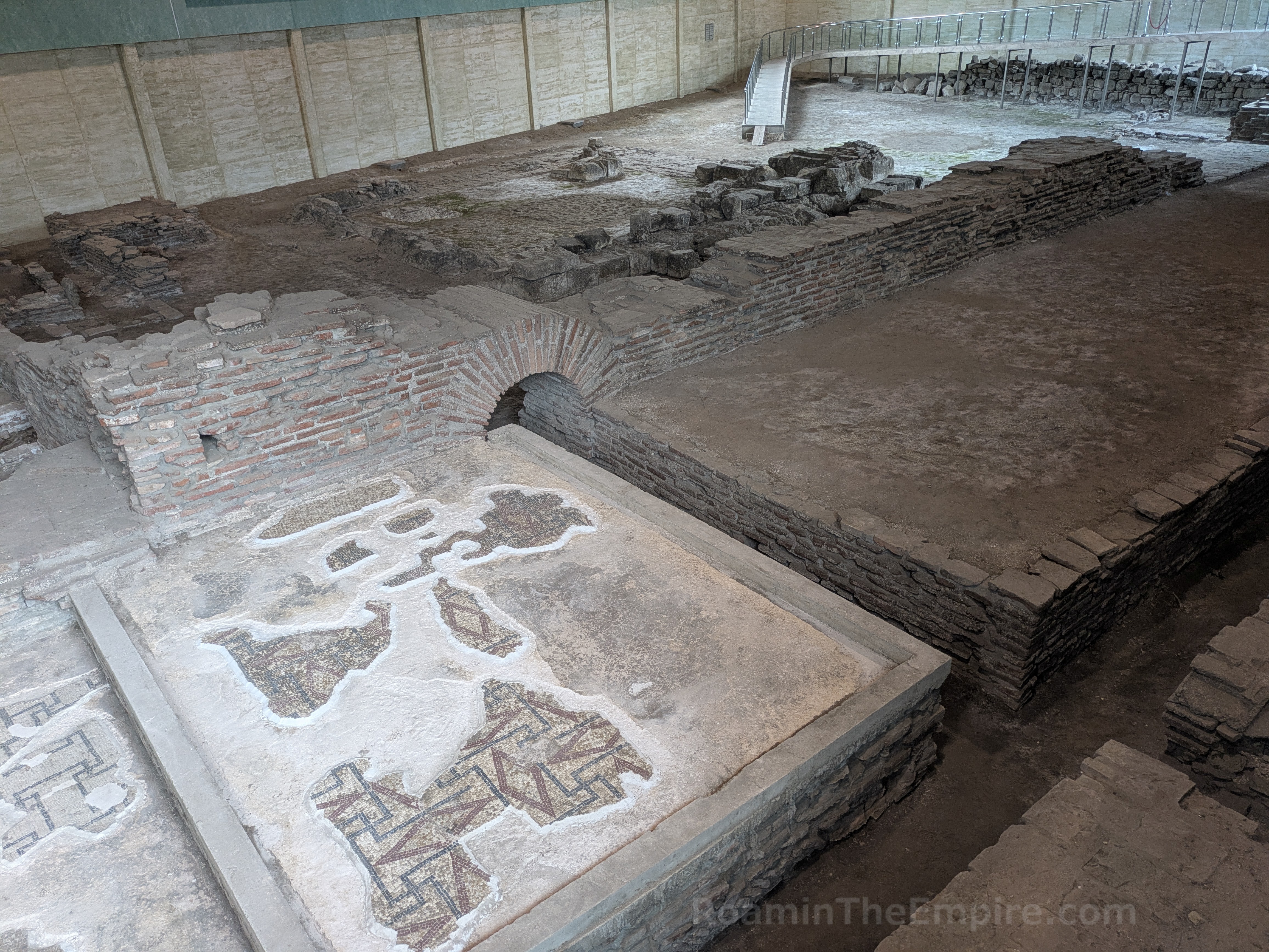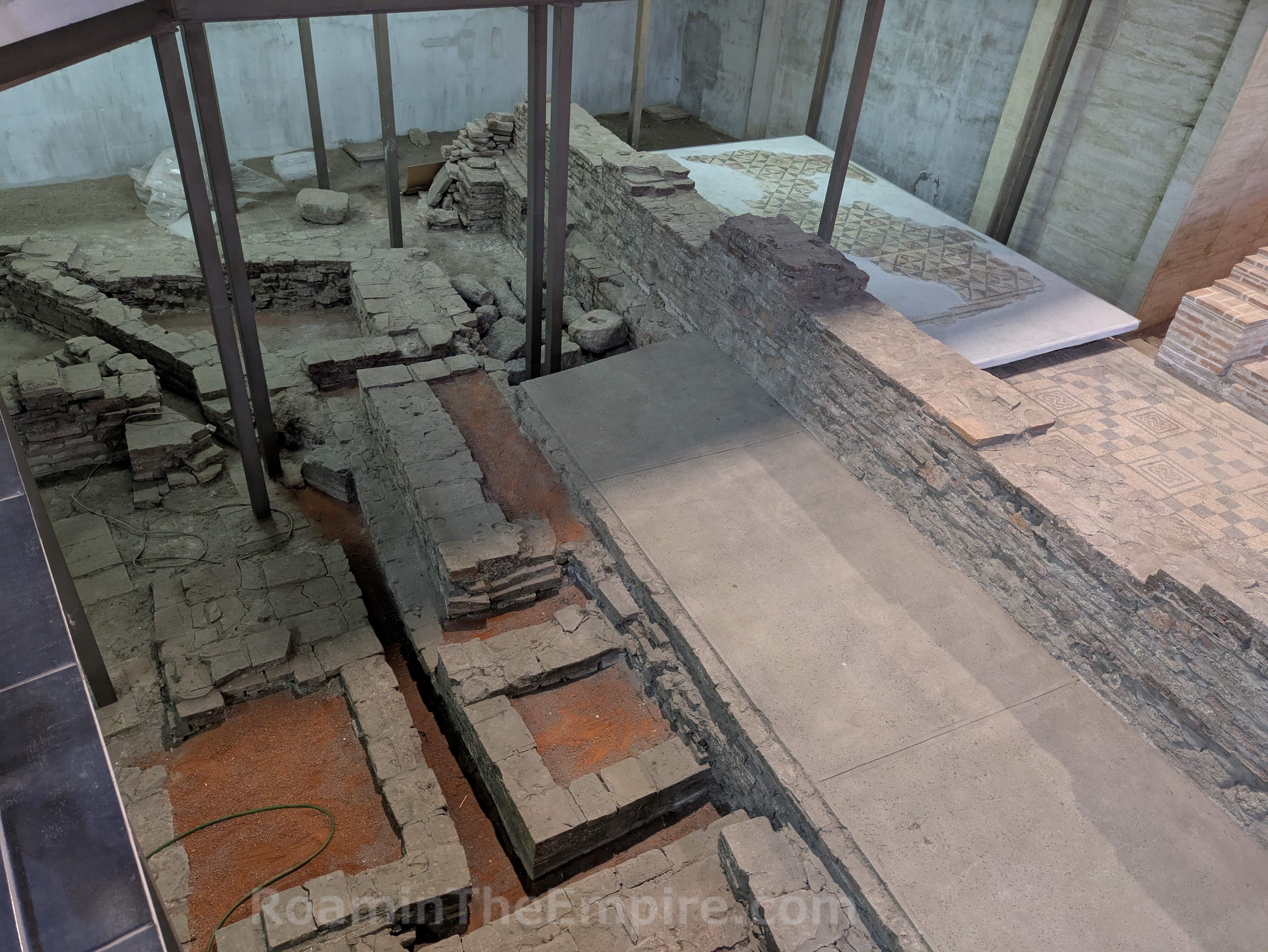 What is preserved is only a small portion of the imperial palace; an interior courtyard along with a number of rooms that surrounded it. Toward the entrance is a long mosaiced corridor that runs along the raised catwalk that serves as the visitor path. A hypocaust system that heated the flooring in this area is visible to the area south of the corridor. Adjacent, but not accessible from the corridor is a large room in which three levels of mosaic pavement were found. Along the eastern wall, which has been partially reconstructed with remnants of fresco, was a marble fountain. A small area at the west end of the corridor with an apsidal niche on the north served as a stairwell to an upper level of the palace. The floor level here is actually the bottom of a hypocaust heating system, with a few of the pilae reconstructed. Beyond the stairwell is another larger apsidal room which seems to have been some kind of hall. Significant remnants of the hypocaust system of the area to the south of this room have been exposed.