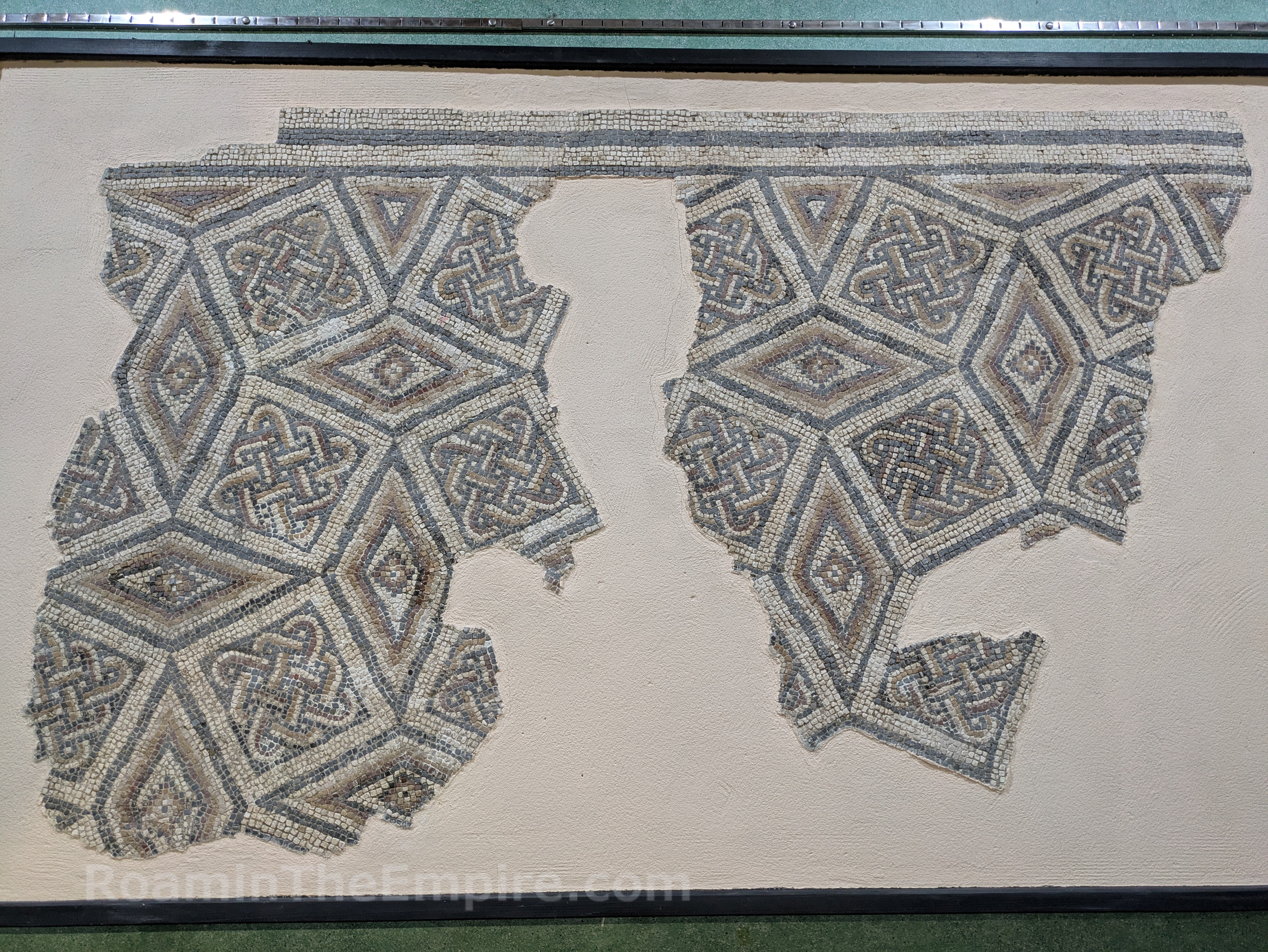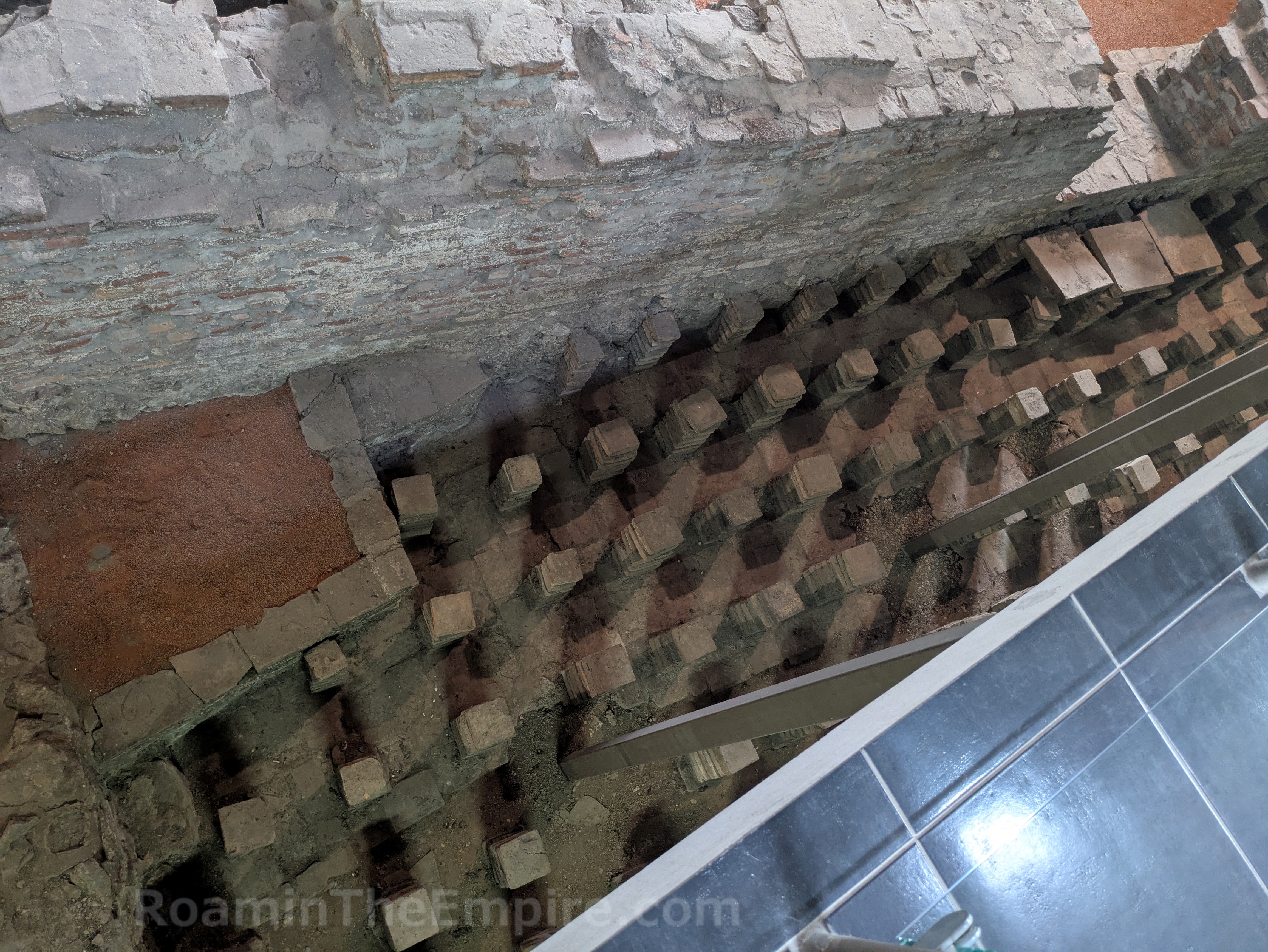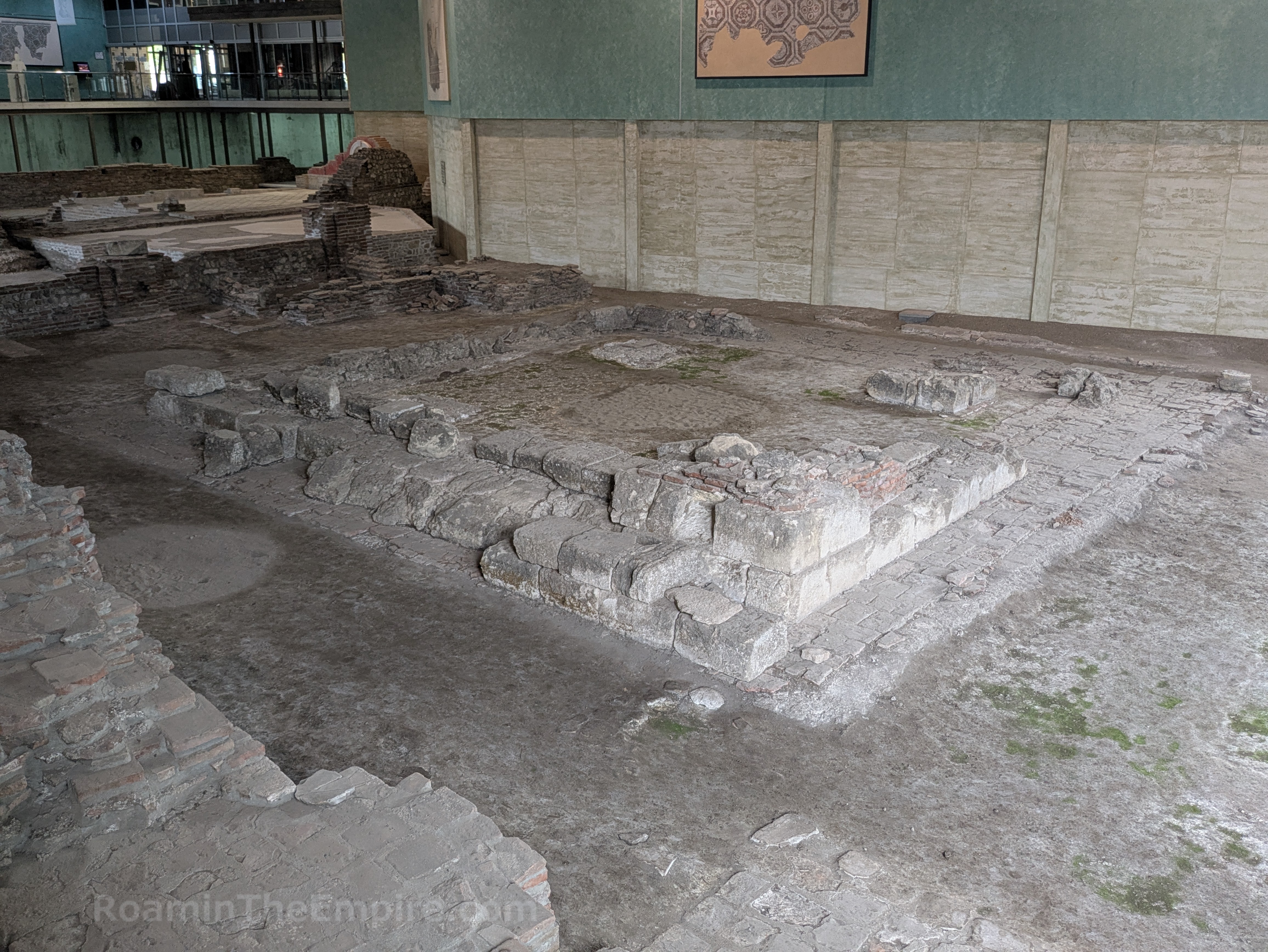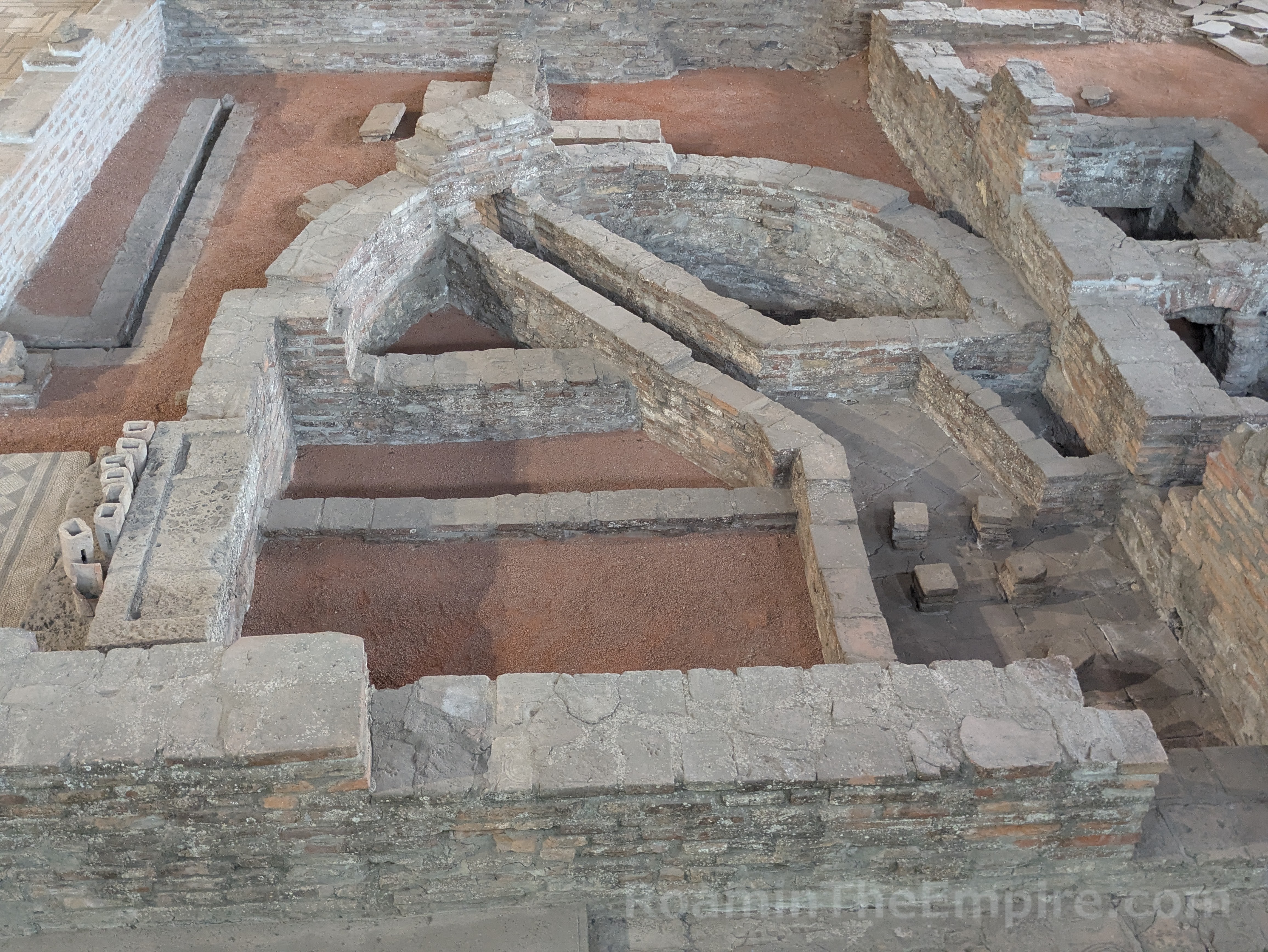 What is preserved is only a small portion of the imperial palace; an interior courtyard along with a number of rooms that surrounded it. Toward the entrance is a long mosaiced corridor that runs along the raised catwalk that serves as the visitor path. A hypocaust system that heated the flooring in this area is visible to the area south of the corridor. Adjacent, but not accessible from the corridor is a large room in which three levels of mosaic pavement were found. Along the eastern wall, which has been partially reconstructed with remnants of fresco, was a marble fountain. A small area at the west end of the corridor with an apsidal niche on the north served as a stairwell to an upper level of the palace. The floor level here is actually the bottom of a hypocaust heating system, with a few of the pilae reconstructed. Beyond the stairwell is another larger apsidal room which seems to have been some kind of hall. Significant remnants of the hypocaust system of the area to the south of this room have been exposed.