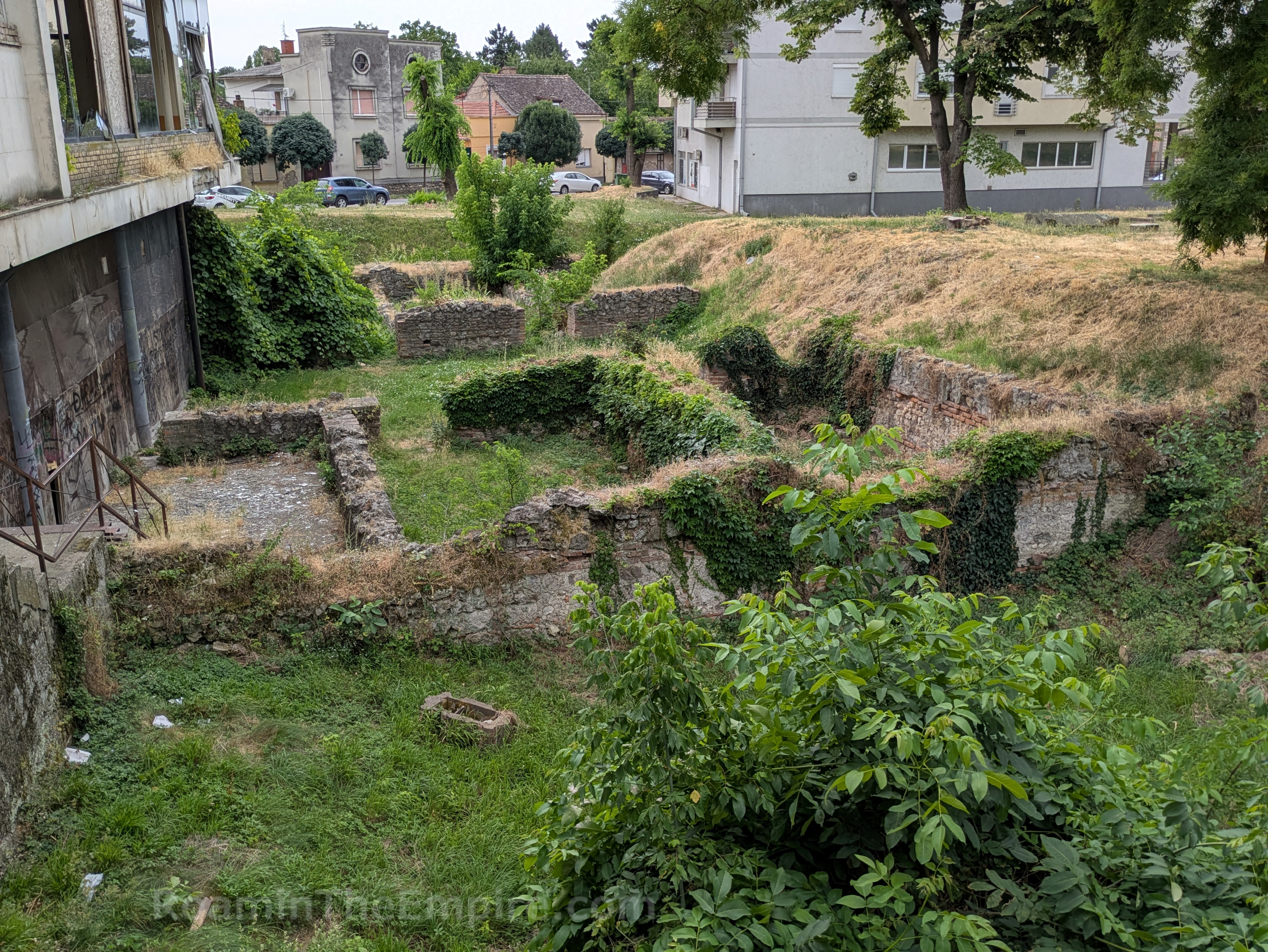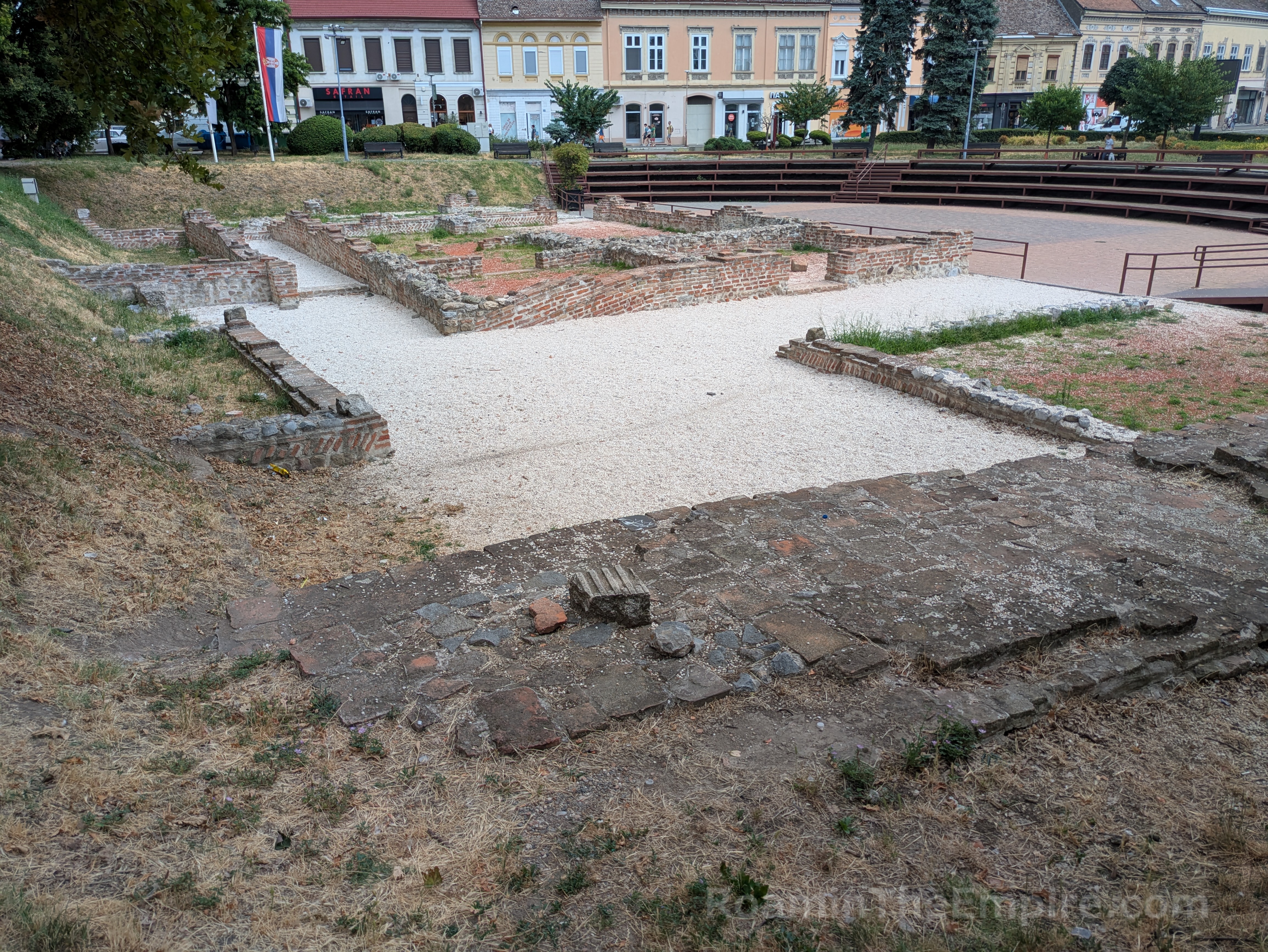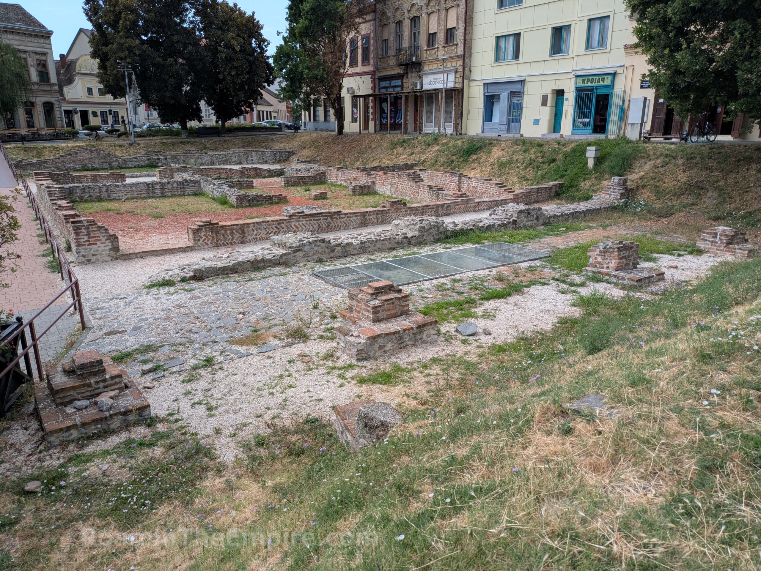 In front of the imperial palace is a 5 way intersection; the road that leads southwest is Svetozara Miletića. About 150 meters down this road is an open access excavated area in a park/greenspace. Running perpendicular from Svetozara Miletića was about a 40 meter stretch of the city walls, with a circular defensive tower at the west end. Abutting the east end of this stretch of wall are a couple of rectangular rooms. Across from those are a few more rooms more or less mirroring those attached to the wall. These are the remainders of a series of horrea that were located adjacent to the walls here.