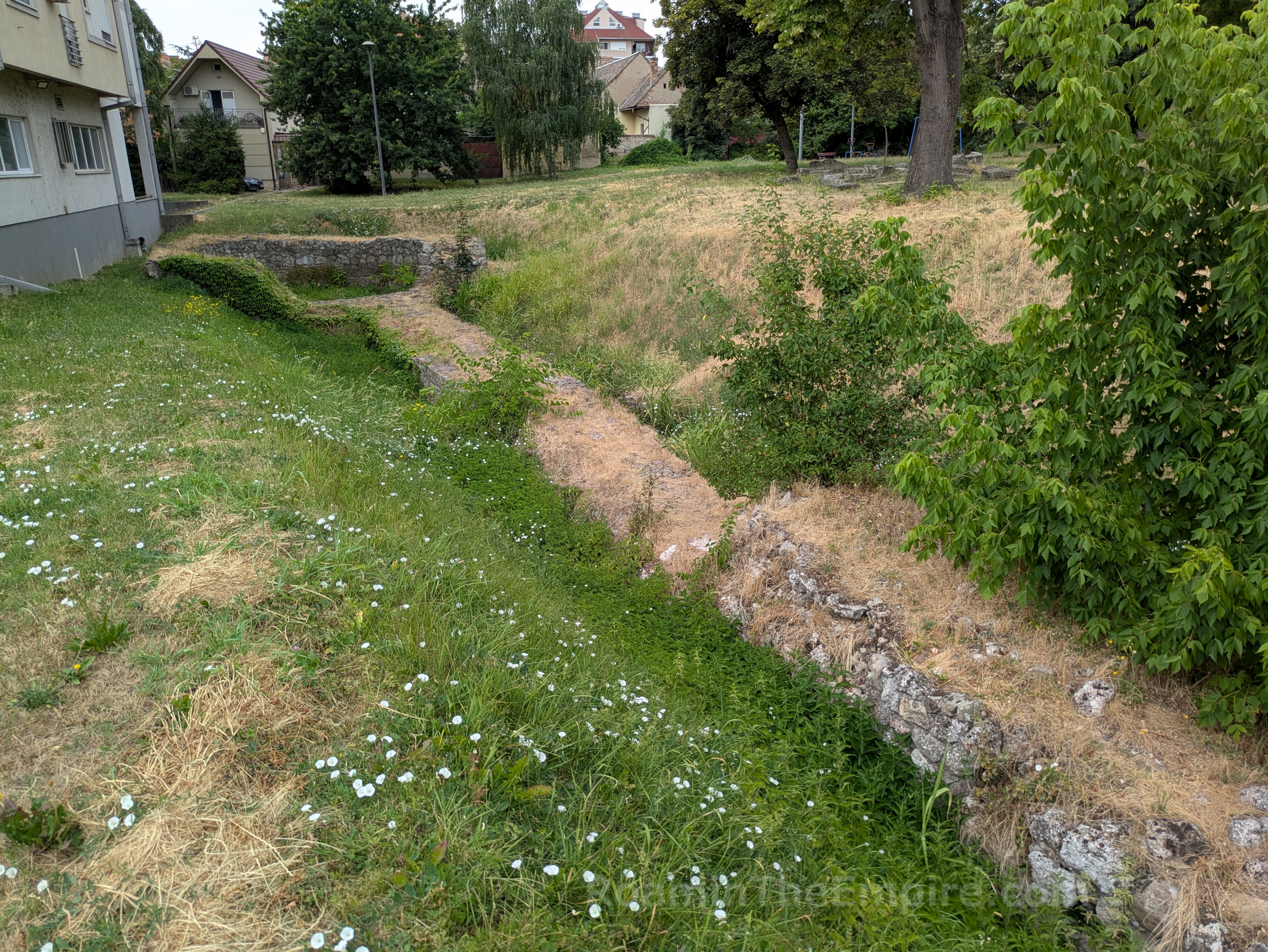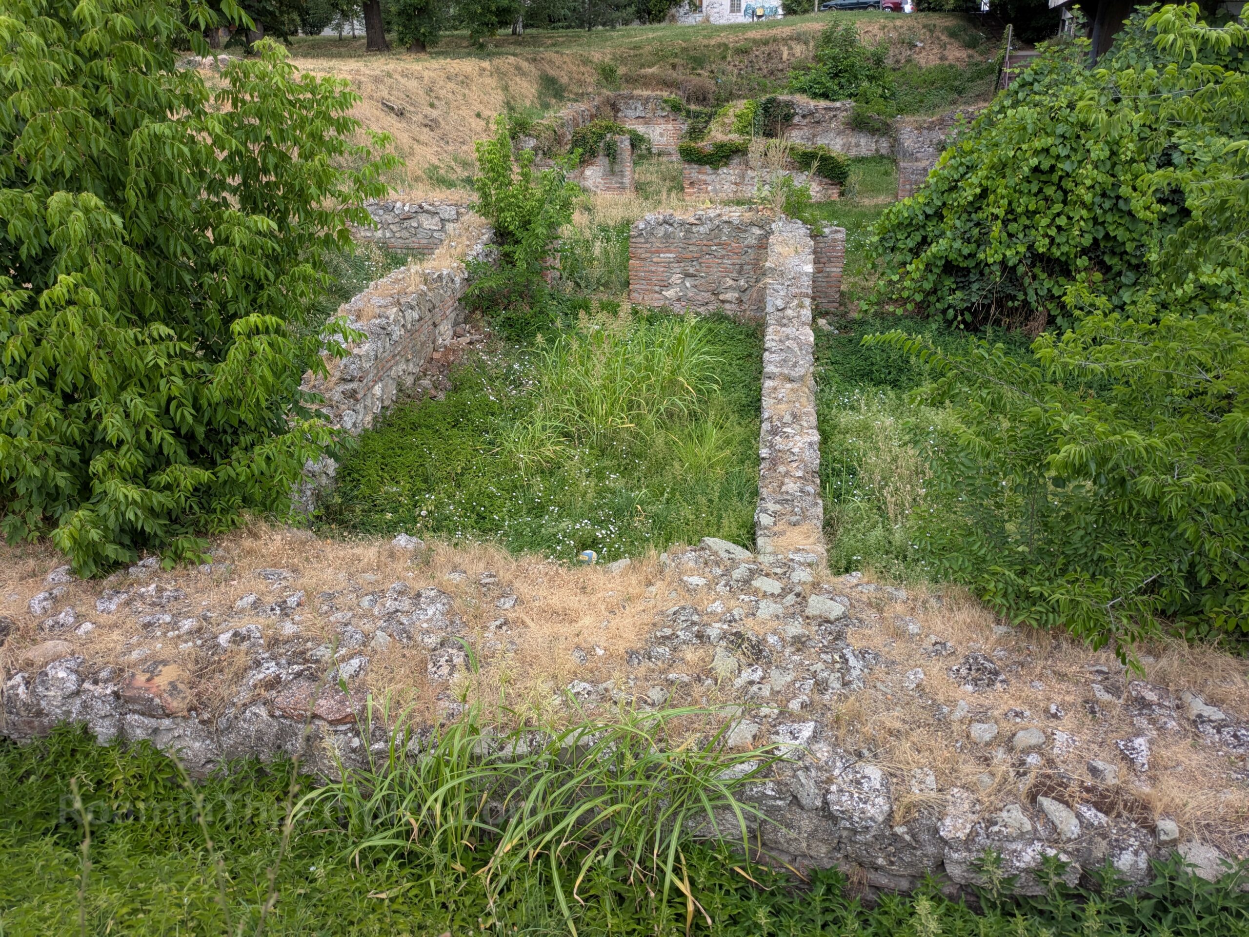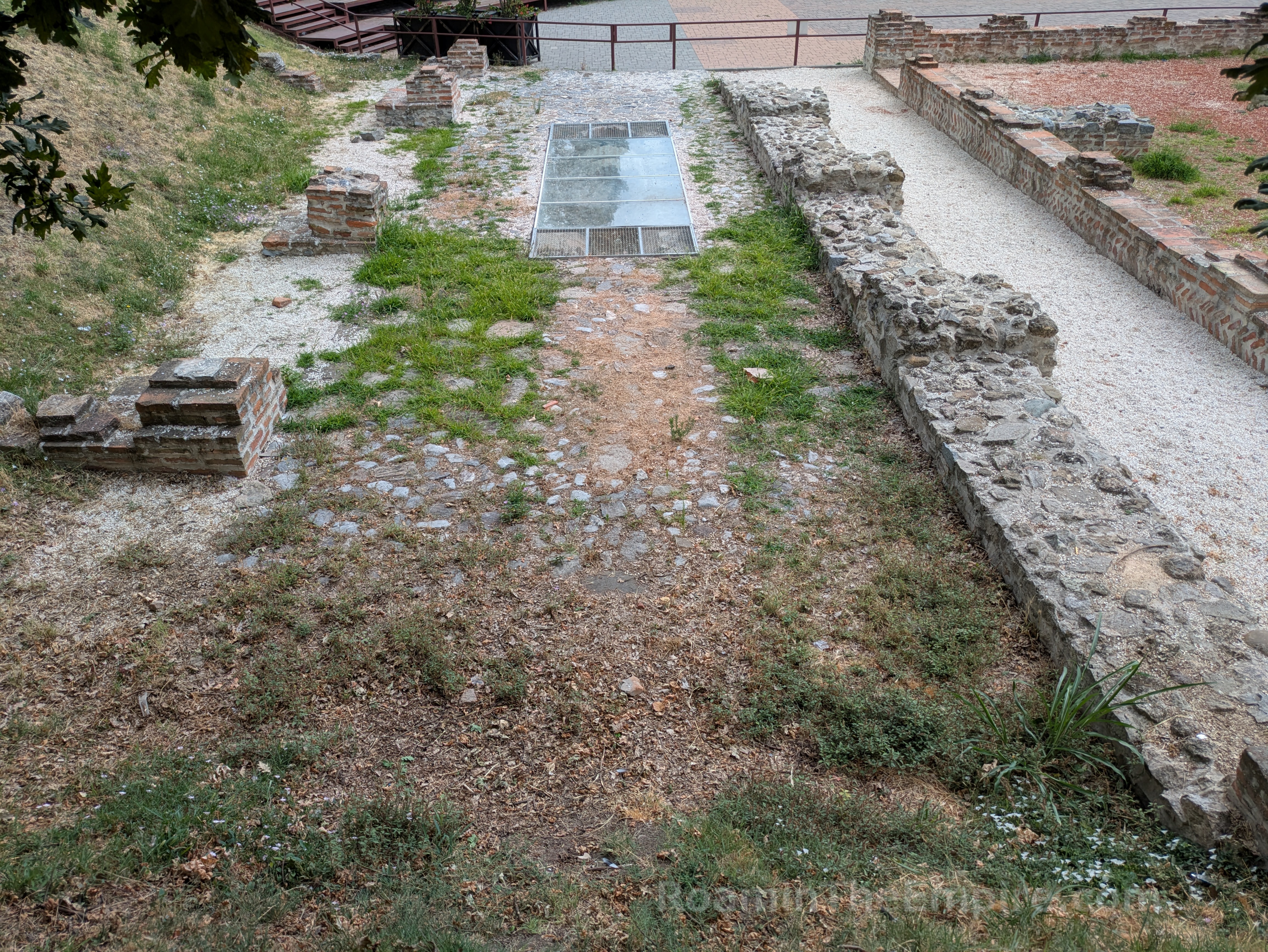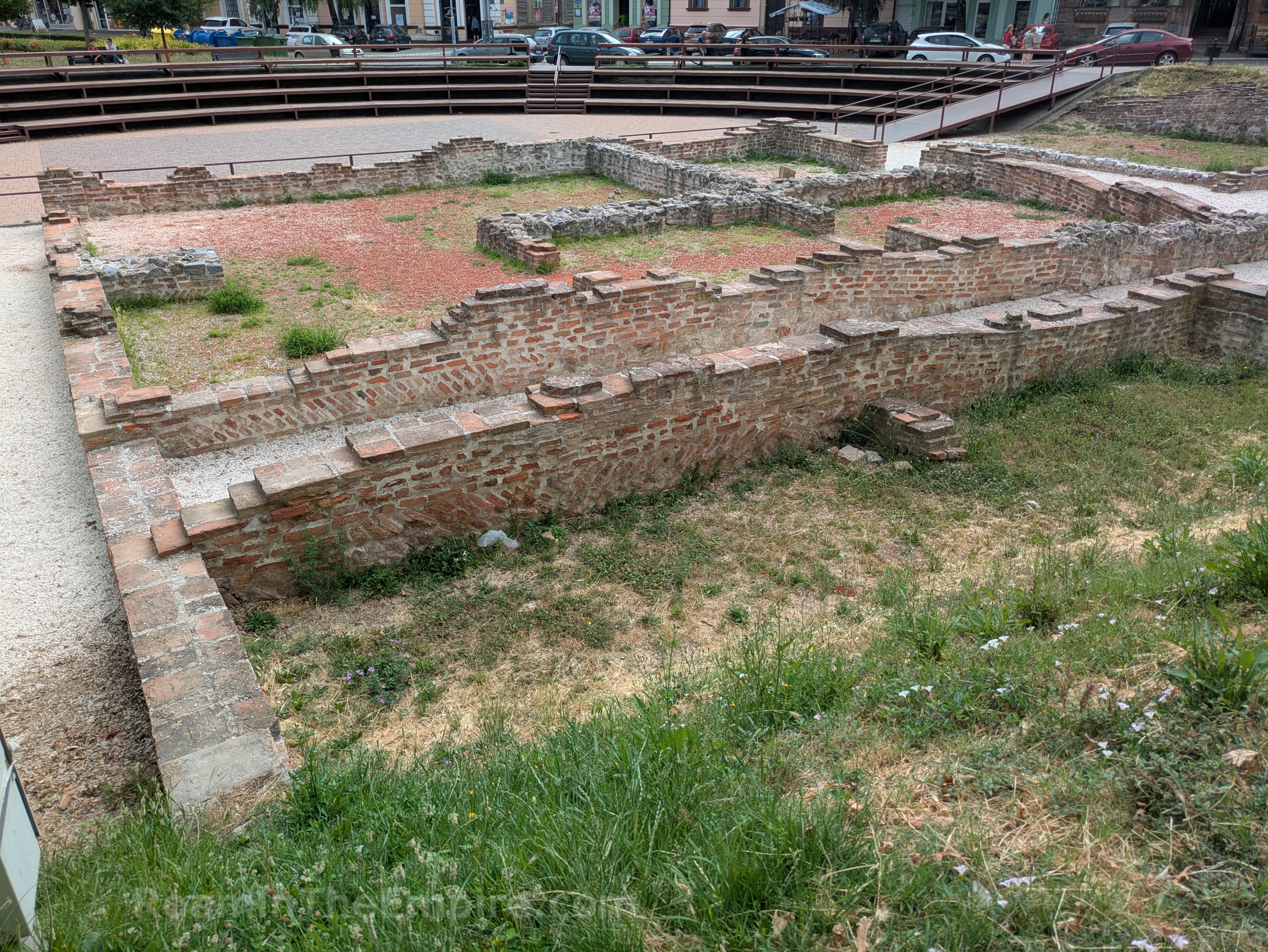 In front of the imperial palace is a 5 way intersection; the road that leads southwest is Svetozara Miletića. About 150 meters down this road is an open access excavated area in a park/greenspace. Running perpendicular from Svetozara Miletića was about a 40 meter stretch of the city walls, with a circular defensive tower at the west end. Abutting the east end of this stretch of wall are a couple of rectangular rooms. Across from those are a few more rooms more or less mirroring those attached to the wall. These are the remainders of a series of horrea that were located adjacent to the walls here.