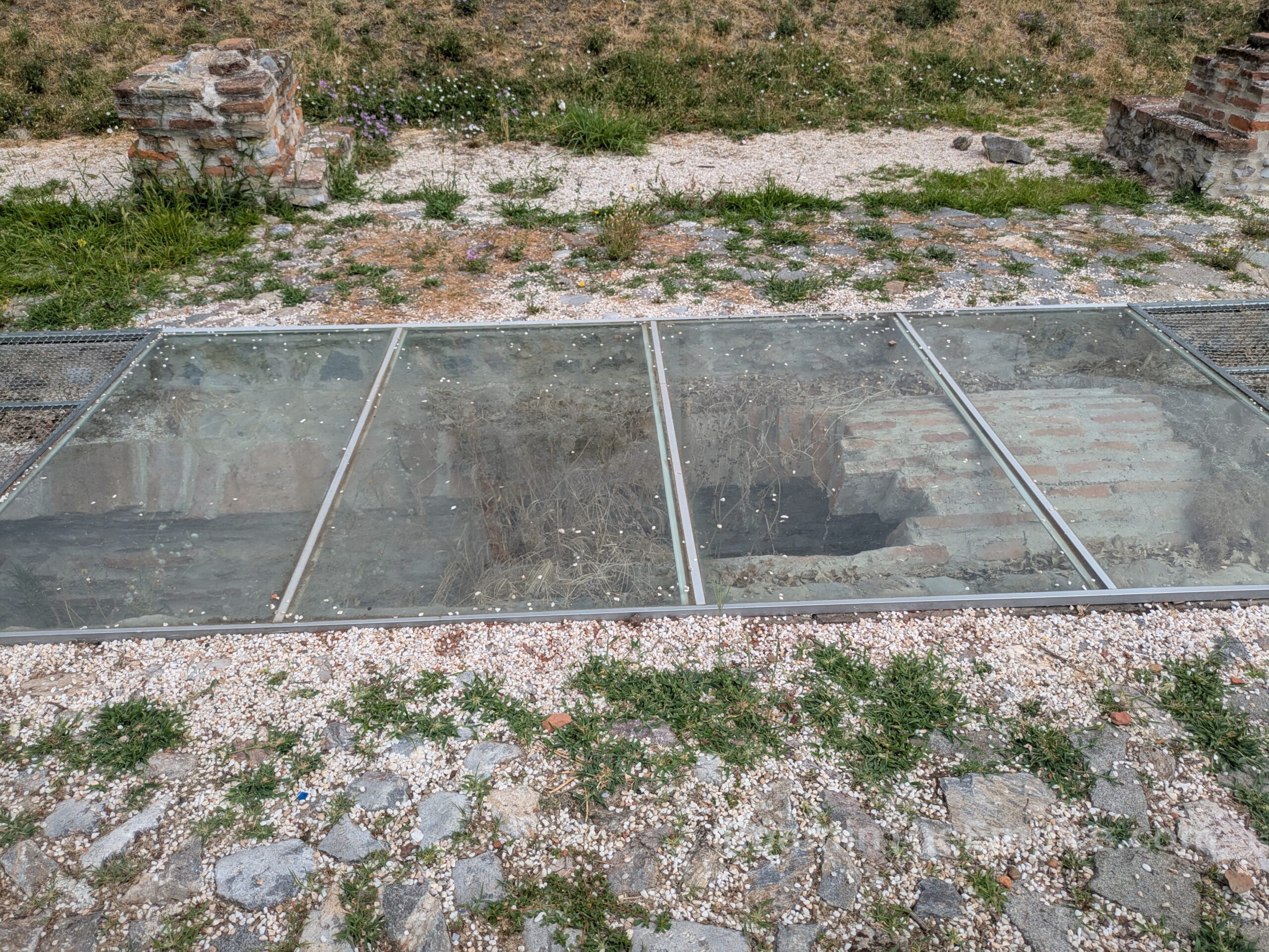 The last spot for ancient Sirmium is about 180 meters west down the road in front of the lapidarium in Trg Žitni. A roughly 40 meter by 25 meter section of a trade quarter abutting the western walls of the city have been excavated here. Originally constructed in the 2nd century CE, the trade quarter remained in use until the 5th century CE. The more robust city wall is visible along the southern side of the excavations, while several non-descript rooms make up most of the rest of the remnants here. Along the northern side of the excavations was a street that served as a connection between the river port and the forum of Sirmium. Part of the sewer channel that ran beneath the street is exposed under a glass protector. The area is part of a public park and is open access with no restrictions.