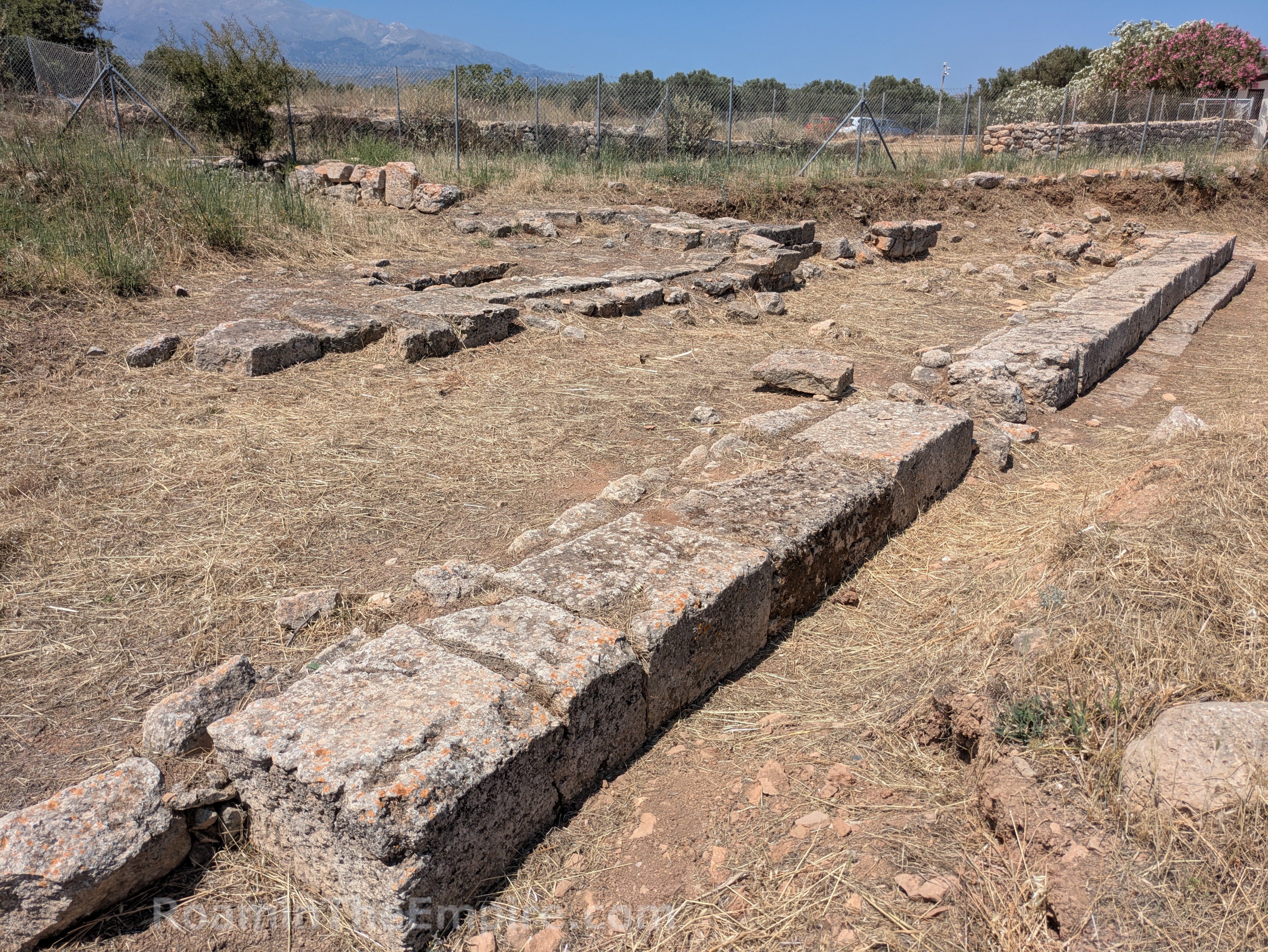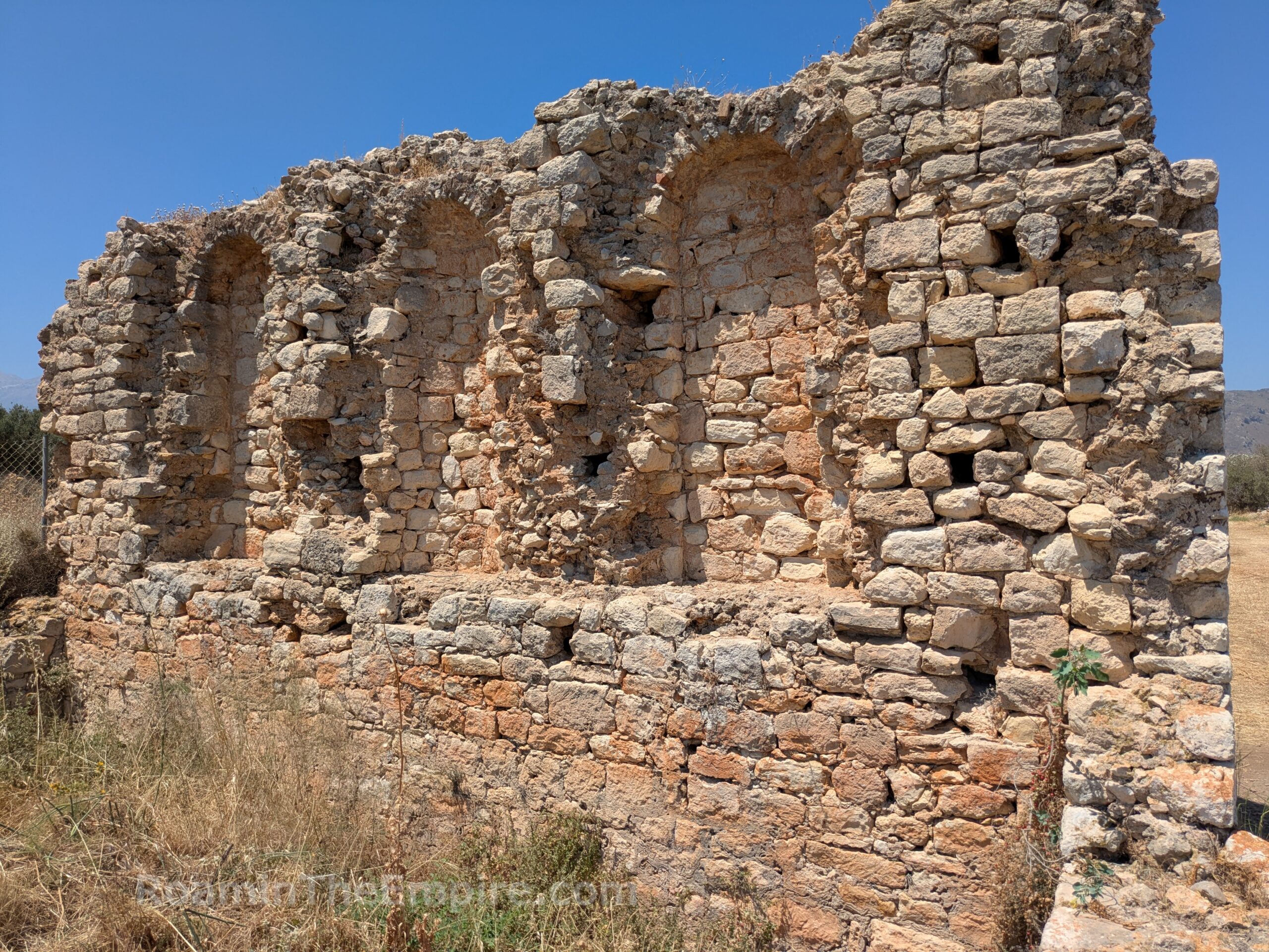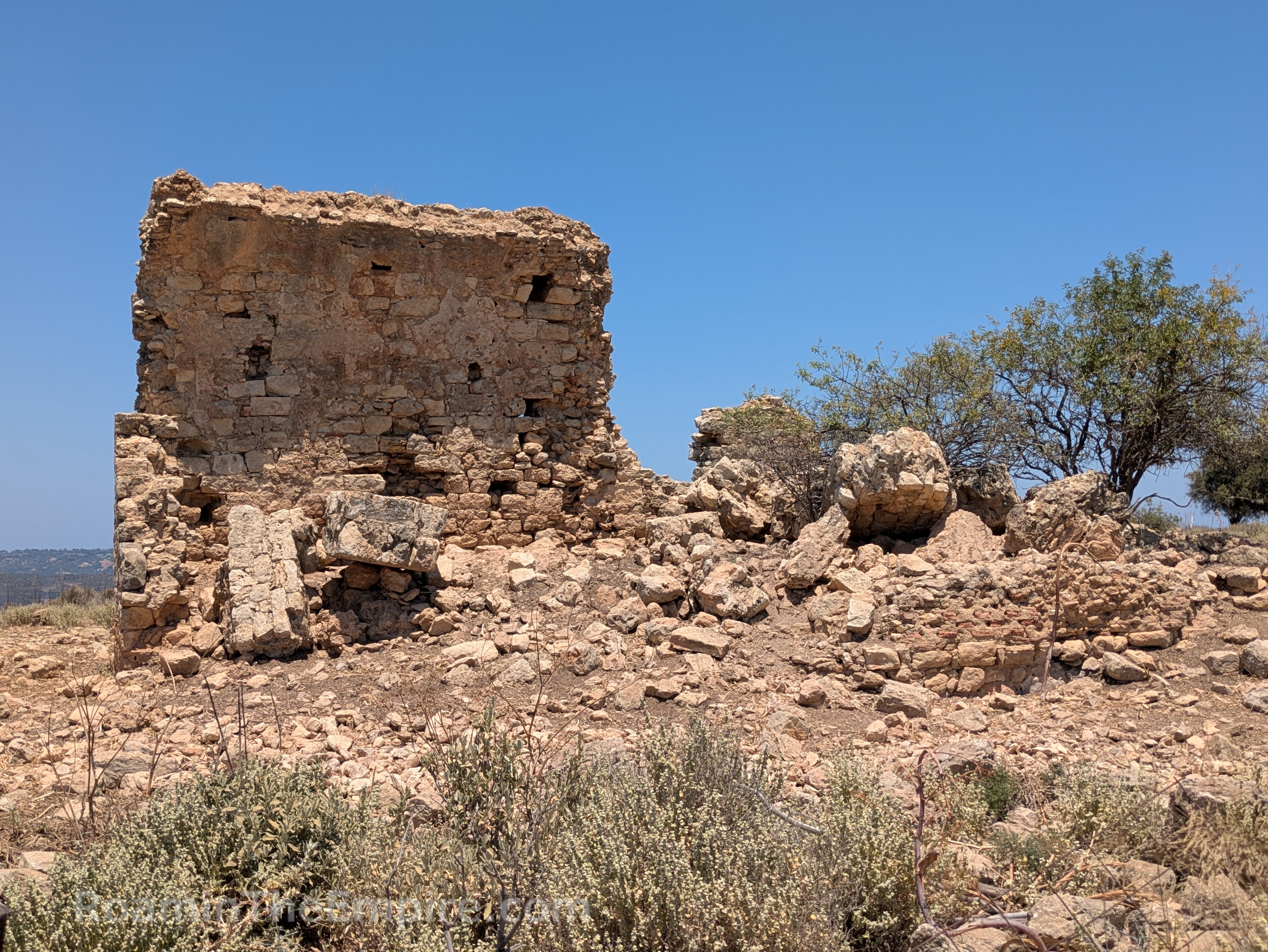 The main road that leads from the modern village of Aptera to the site continues on to the northeast past the turnoff to the site. About 200 meters down this is a crumbling bit of wall in a small field on the north side of the road. It’s unclear what this wall belonged to, but it does bear some resemblance to the Baths II complex. At the top of the wall, some curving is perceptible, indicating it had a vaulted ceiling. A pile of larger fragments of walls sits on the north side of the more complete part of the wall that is preserved to a significant height. The area is somewhat fenced, it looks to be adjacent or part of someone’s animal enclosure. The brush along the road does a better job of preventing direct access than the fence does, though.