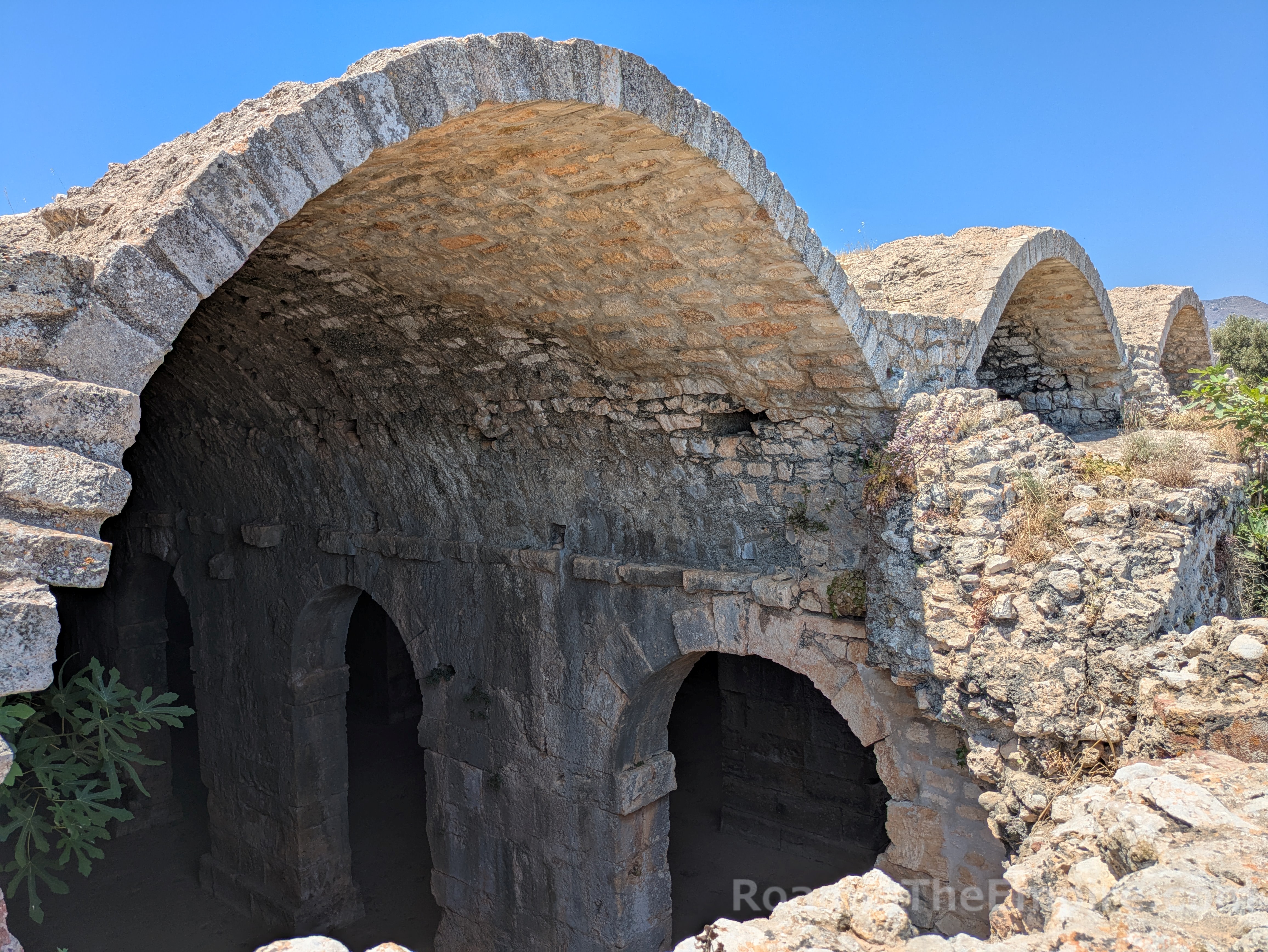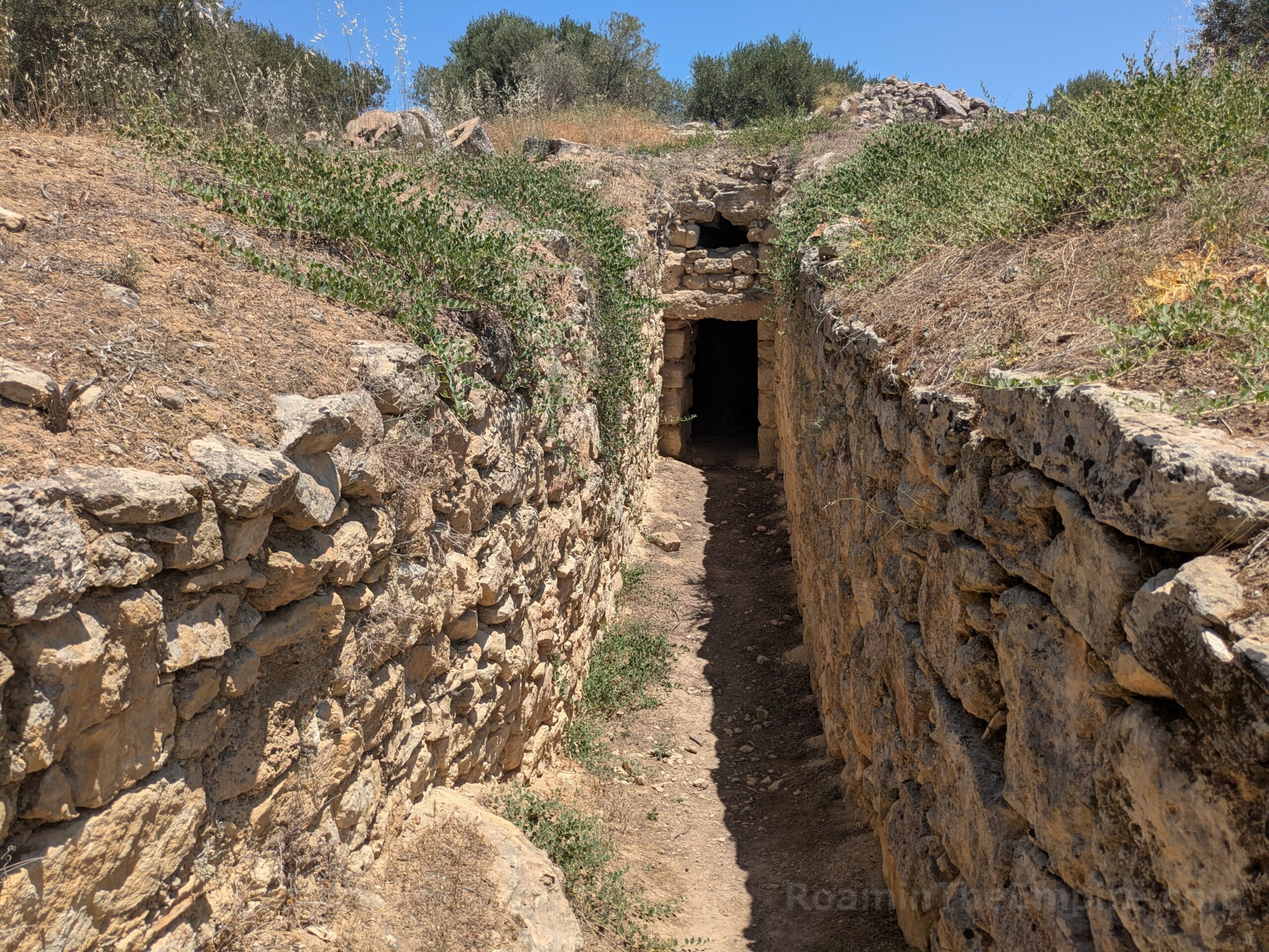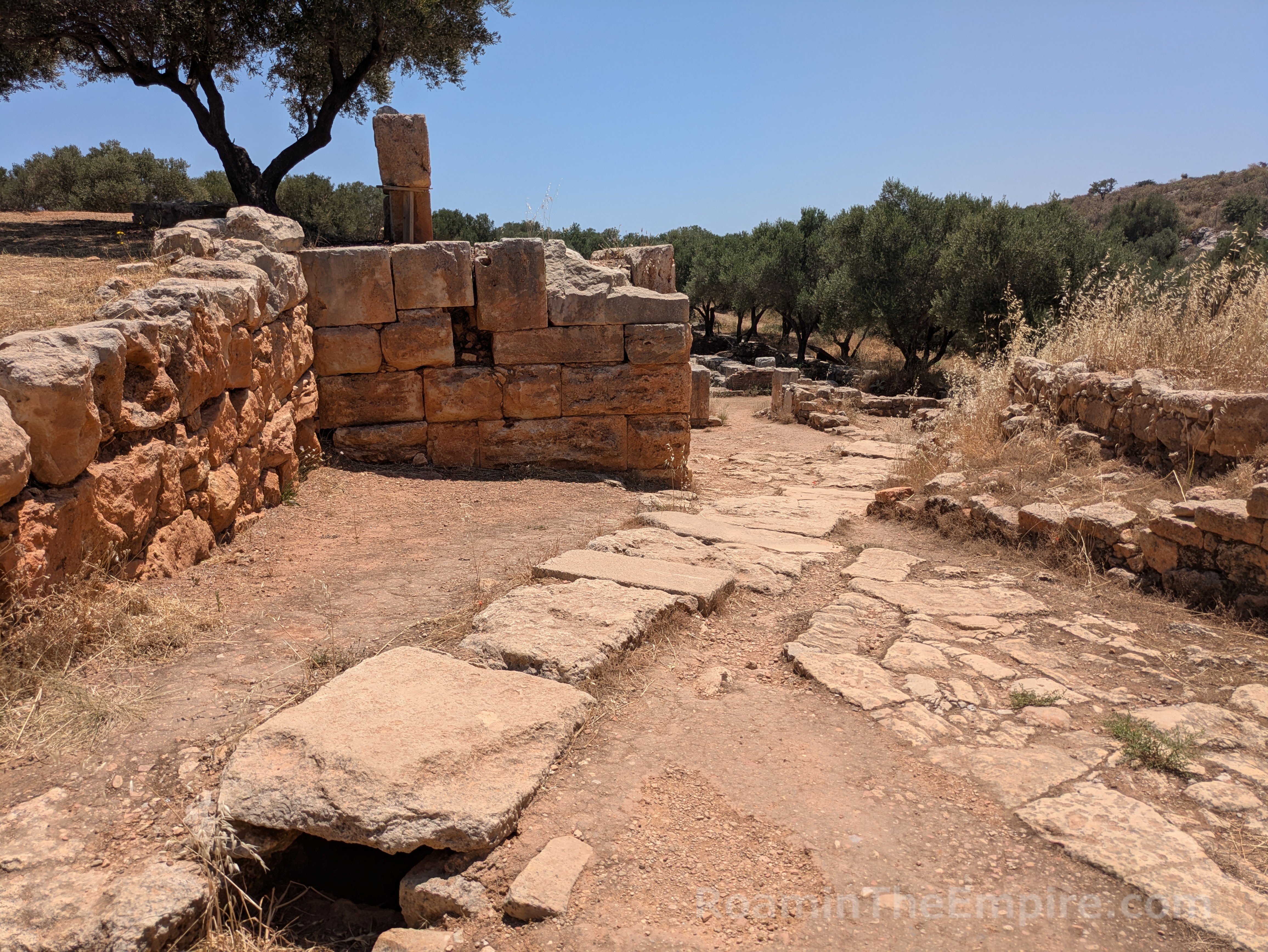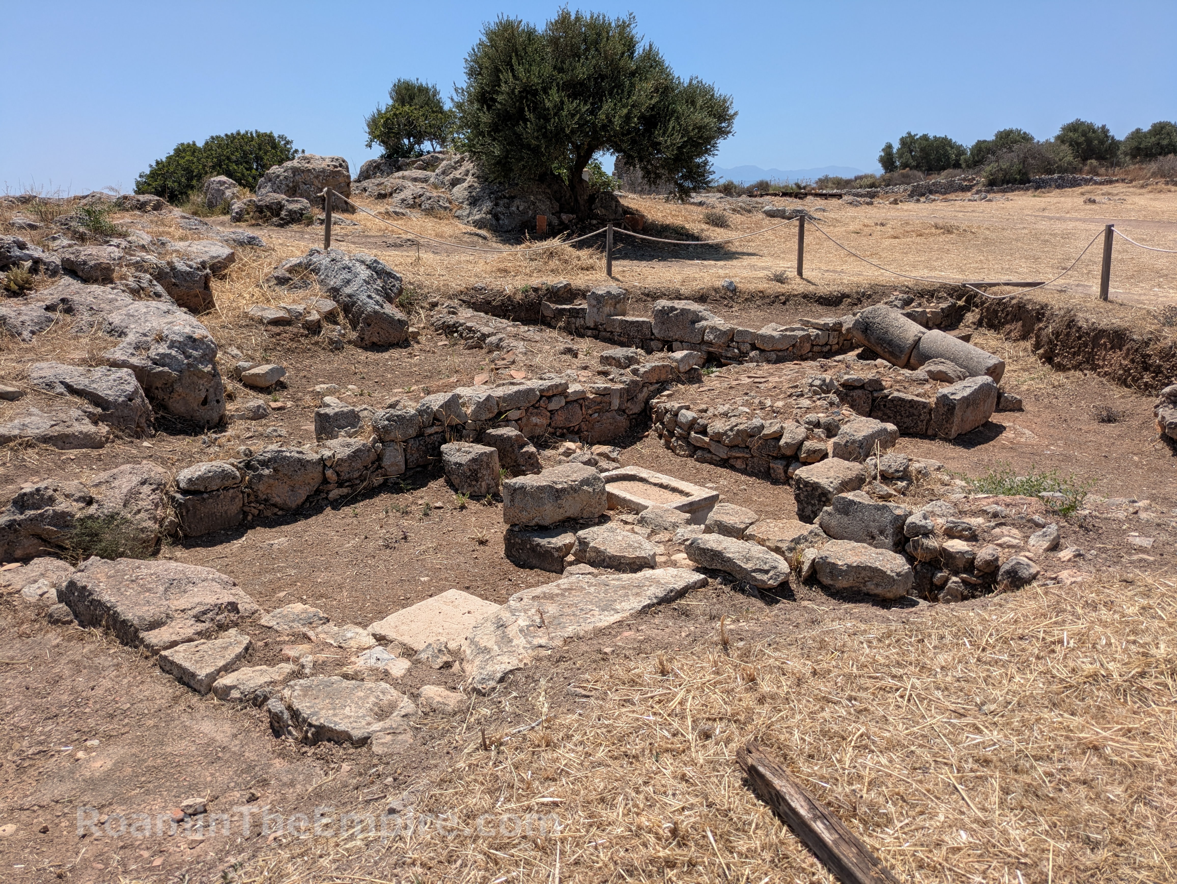 The fortification walls in addition to the west gate, necropolis, and Roman house add another half an hour or so on to the two hours in the archaeological park; depending on how much of the walls you explore. Also depending on whether you have a vehicle. It’s also worth noting that there are a few vestiges of the earlier settlement located about 4 kilometers away by vehicle. A vaulted tholos tomb dating to the 15th-14th century BCE is located along the road between modern Aptera and Stilos. An unlocked gate and informational side alongside the road, opposite a small parking area, indicate the location. It is an otherwise unsupervised site and there is direct access to the interior of the tomb. The tomb is in very good condition and well taken care of with a mostly intact roof. A little farther along the road are the remnants of the Minoan settlement, which include a kiln as well as some Archaic period buildings. I was unable to get through the fence to this site, though, and can’t comment on accessibility or preservation.