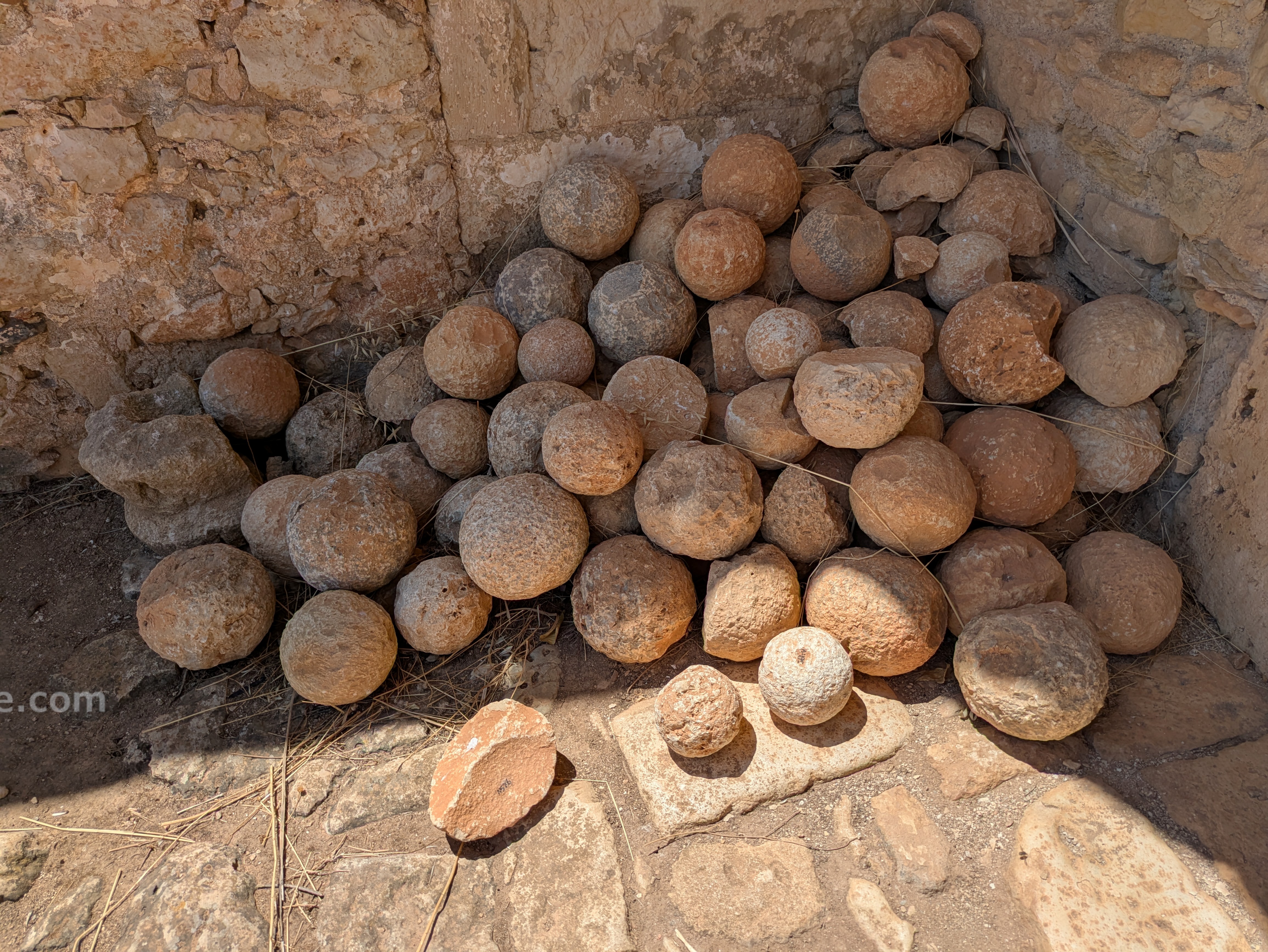 To the west of the public building, more or less at the center of the archaeological site, is the large restored 12th century CE Monastery of St. John the Theologian. According to information on site, elements of ancient Aptera were employed in the construction. There are supposedly a few inscriptions built into the walls of the monastery, but several circuits around all the publicly accessible areas did not reveal any visible inscriptions. The monastery also hosts some informational exhibitions for the site as well as the site facilities such as the restroom. In the west part of the courtyard is a pile of stone ball projectiles that were found at the main gate of the site.