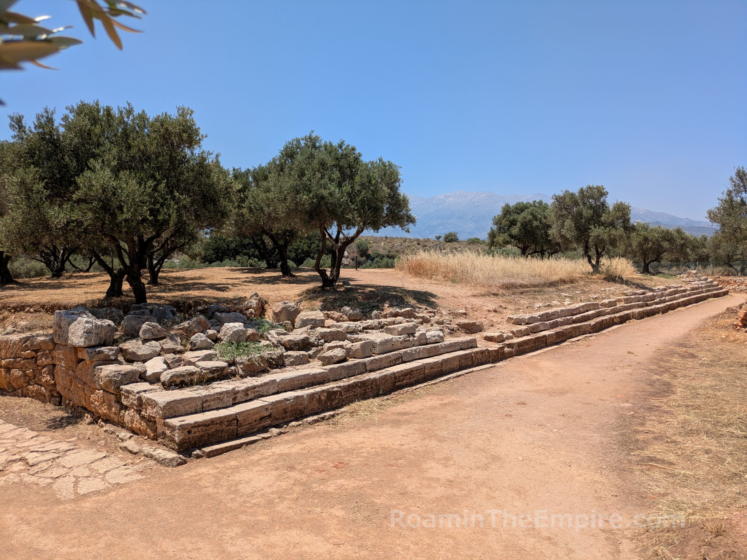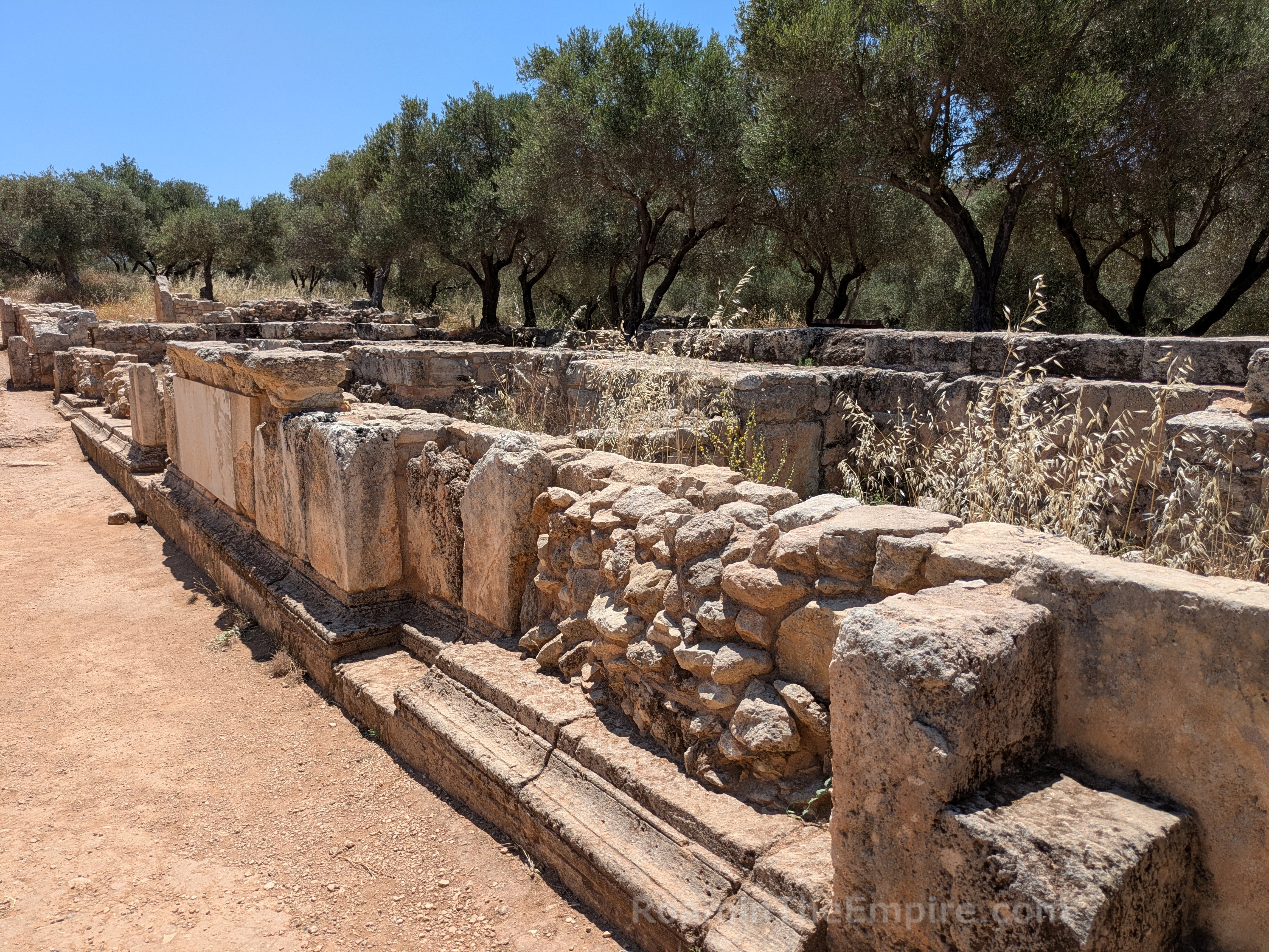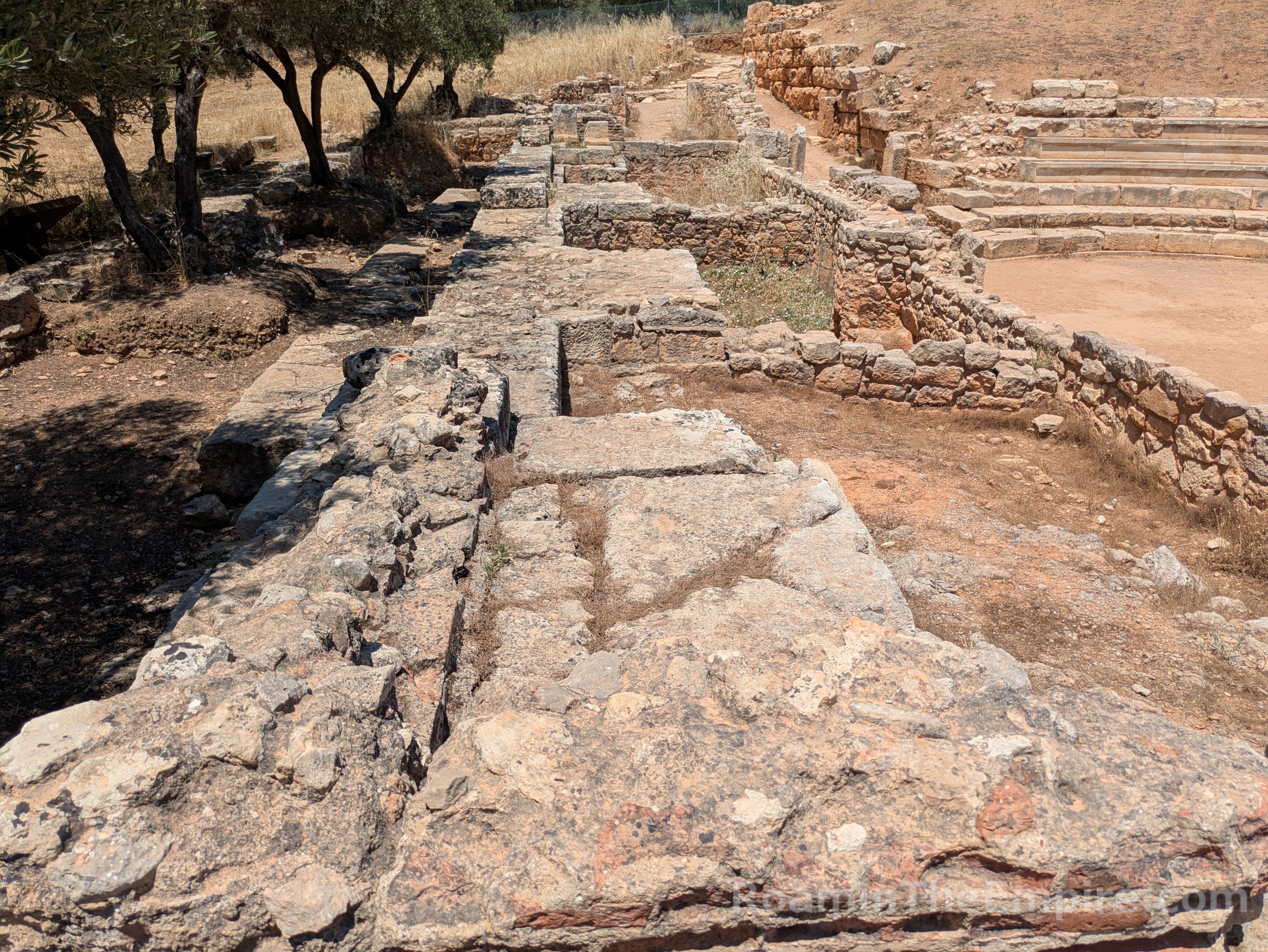 Upon approaching the area of the theater, the path splits off in two directions. To the southeast, the path is partially paved with an ancient road. Along the southwestern path is a stepped stone structure. Only two steps are visible at the eastern extent, but a third becomes visible continuing along to the southwest, and finally at the southwestern extent, several more are preserved. This roughly 50 meter long structure is the so-called rectilinear theater. It was built in the first half of the 3rd century BCE, shortly after the main theater, and may have served in part as a retaining wall for the main theater. Originally it consisted of 11-13 rows of seating with four staircases (still discernable) dividing the seating into more or less equal sections and is estimated to have held 600-700 spectators. It is similar in form to older Minoan theaters, and may have served a religious function. The form is similar to other cult spaces related to chthonic deities, so it may have been used in that capacity and additionally been employed for other religious or civic uses.