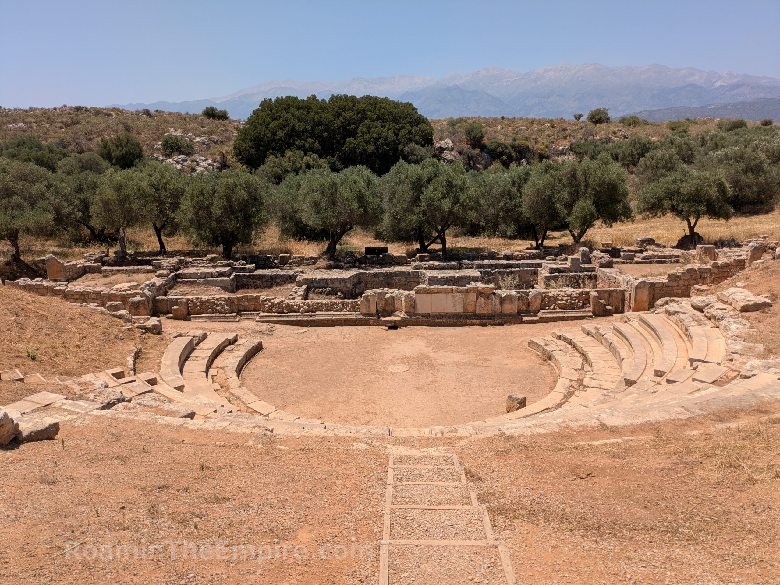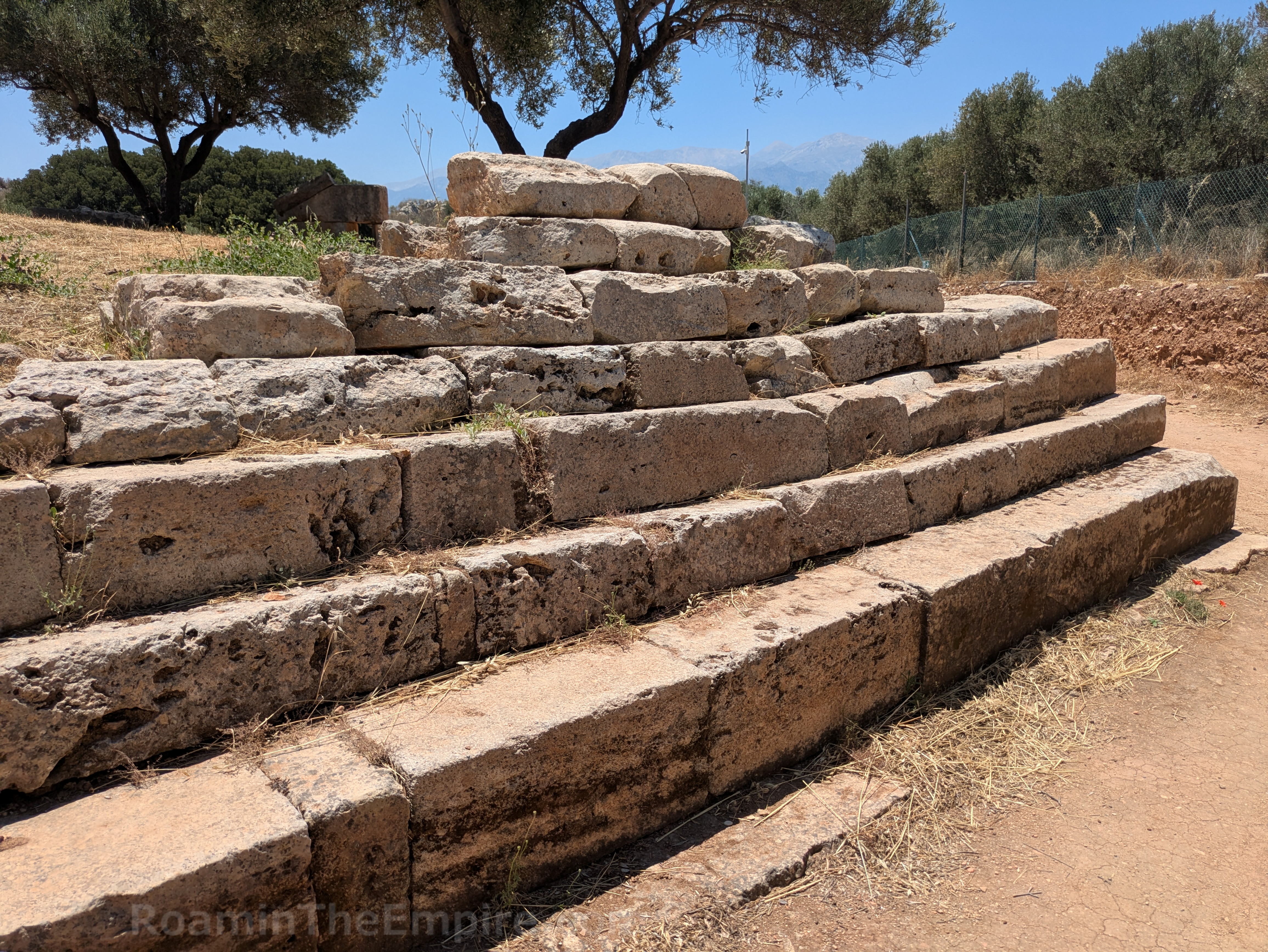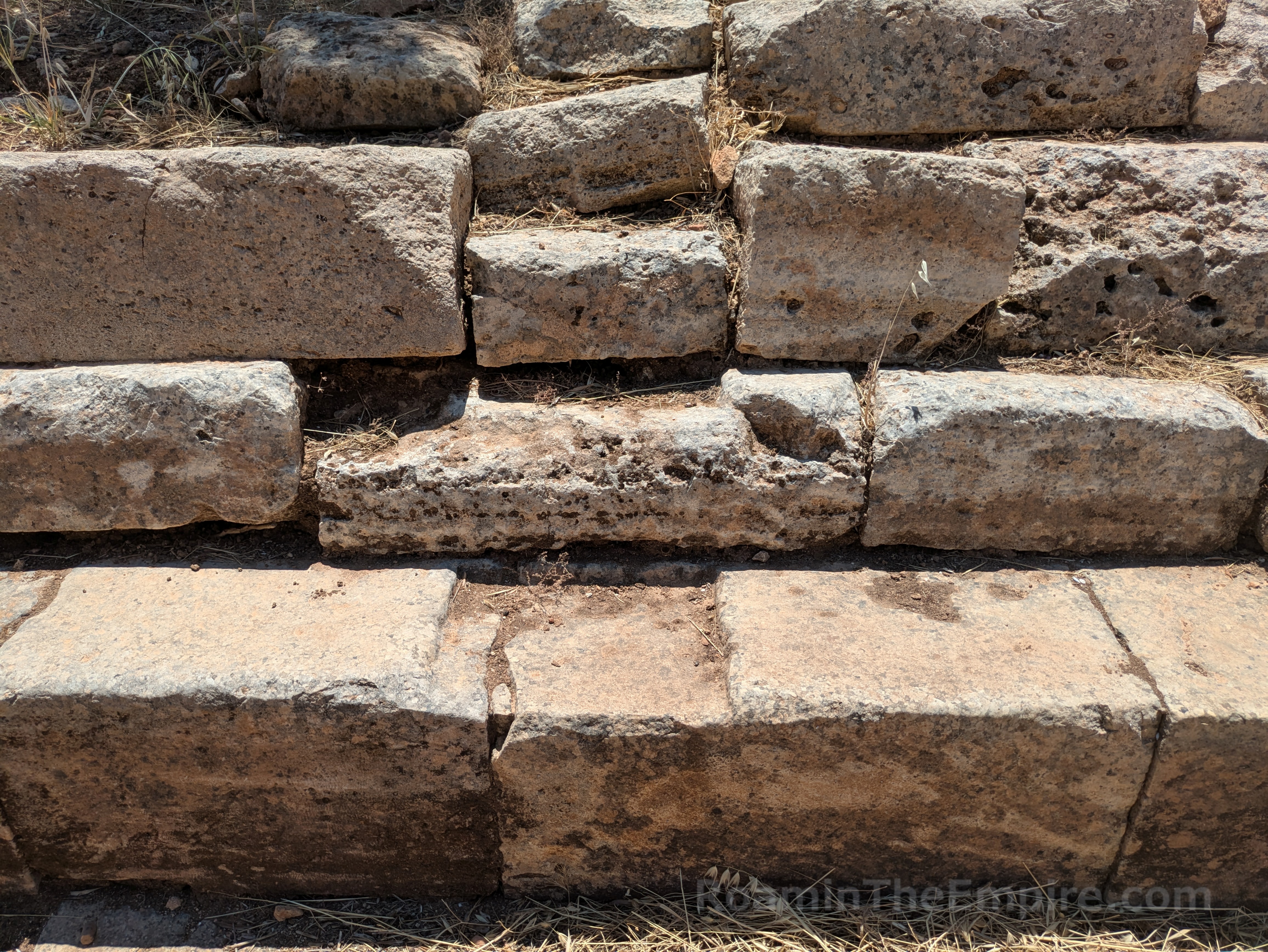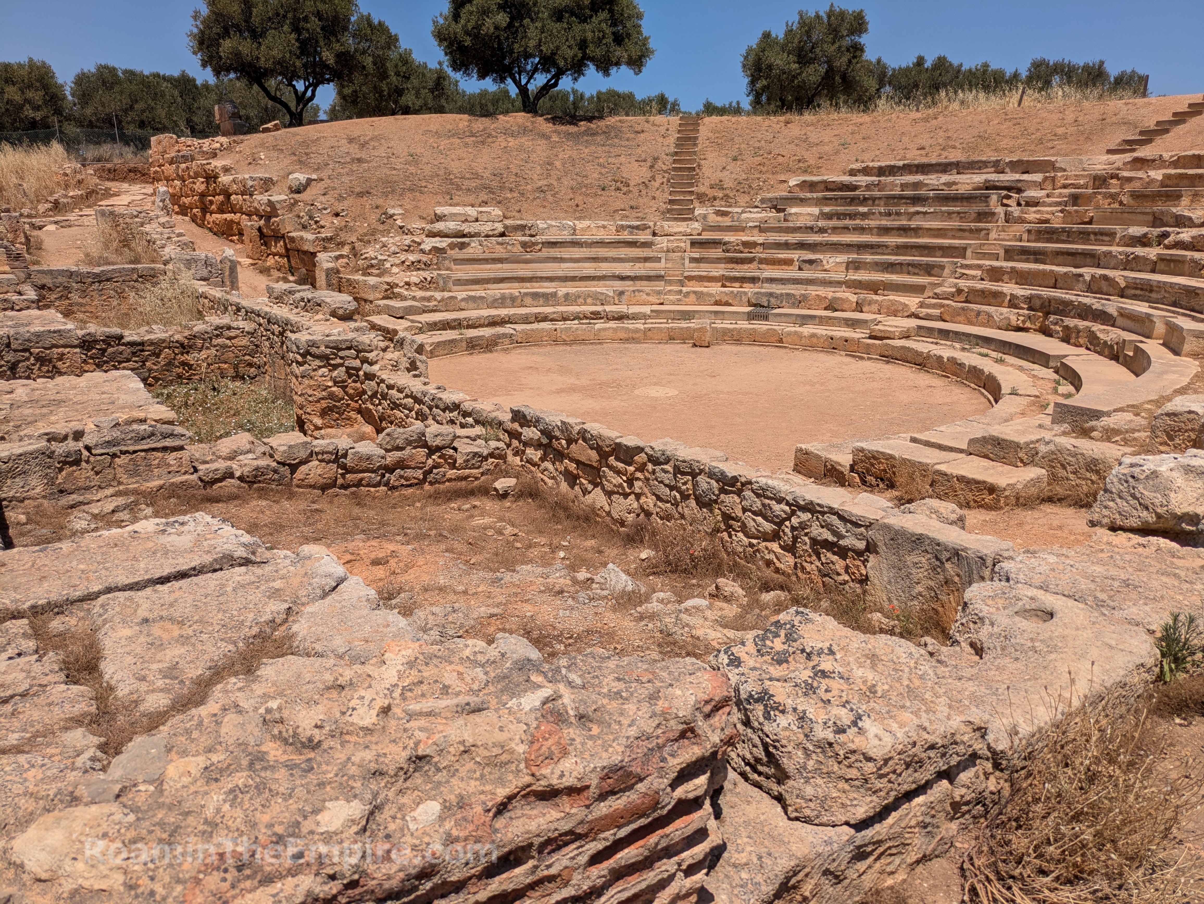 Upon approaching the area of the theater, the path splits off in two directions. To the southeast, the path is partially paved with an ancient road. Along the southwestern path is a stepped stone structure. Only two steps are visible at the eastern extent, but a third becomes visible continuing along to the southwest, and finally at the southwestern extent, several more are preserved. This roughly 50 meter long structure is the so-called rectilinear theater. It was built in the first half of the 3rd century BCE, shortly after the main theater, and may have served in part as a retaining wall for the main theater. Originally it consisted of 11-13 rows of seating with four staircases (still discernable) dividing the seating into more or less equal sections and is estimated to have held 600-700 spectators. It is similar in form to older Minoan theaters, and may have served a religious function. The form is similar to other cult spaces related to chthonic deities, so it may have been used in that capacity and additionally been employed for other religious or civic uses.