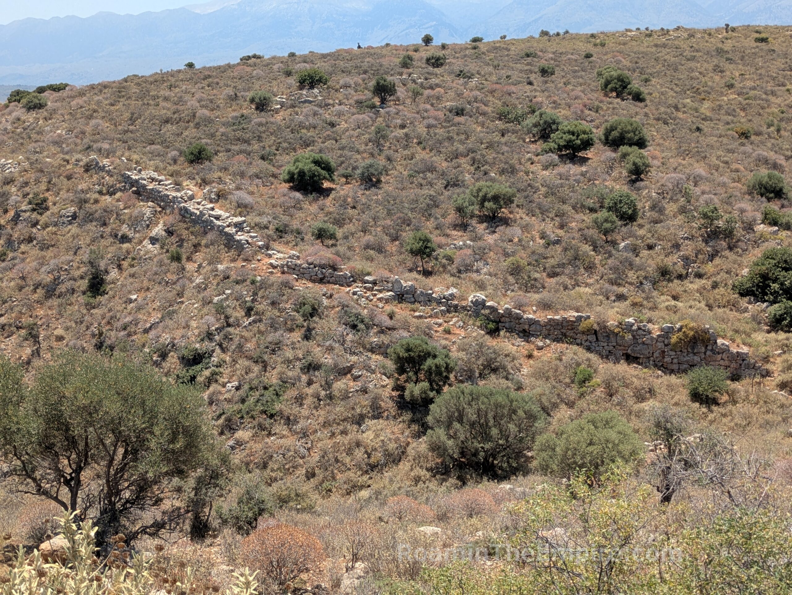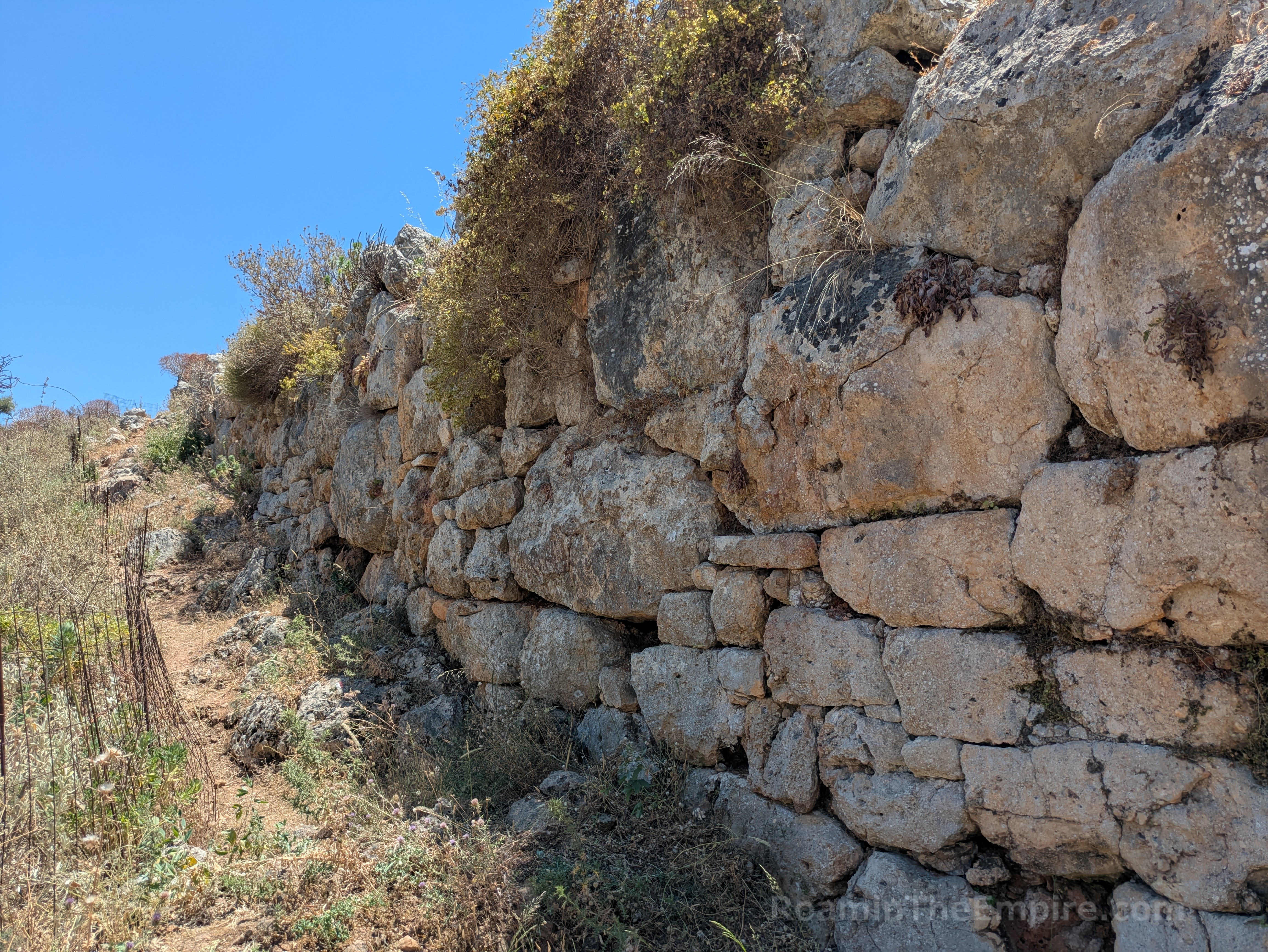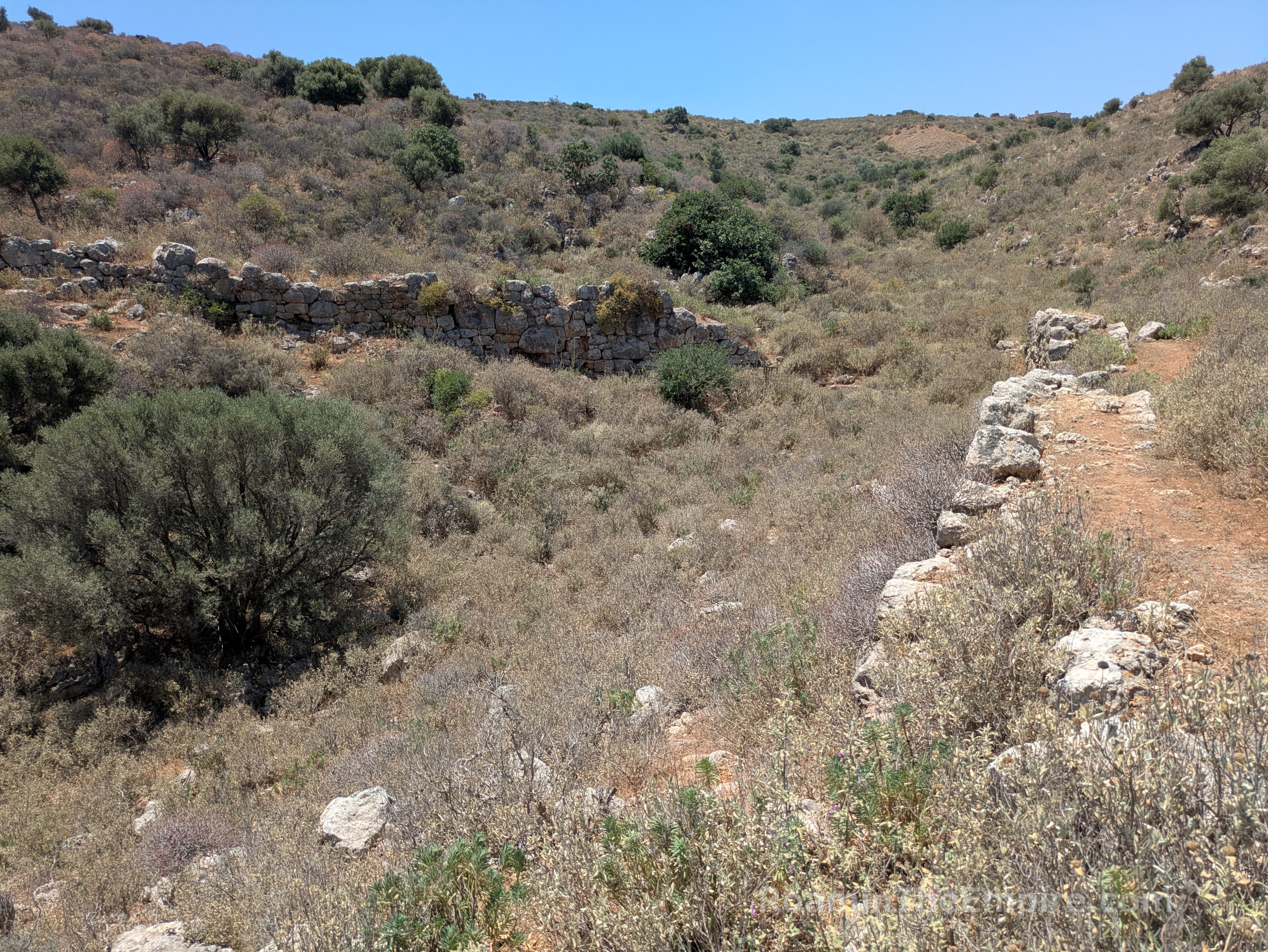 At the end of the road, another 500 meters or so farther, is the 19th century CE Koules Ottoman Fortress. Across a ravine to the south of the fortress on the opposite ridge are the remnants of the eastern fortification walls of Aptera. The fortifications of Aptera were constructed in the 4th century BCE and had a total circuit of about 3.5 kilometers. The walls actually start on the side of the same ridge as the fortress, and so also enclosed the ridge on which the fortress sits. A path about 40 meters past the parking lot area of the fortress leads through a gate and down into the ravine along the top of the remnants of the wall. The walls then climb back up the ridge opposite the fortress. The path continues along this leg of the fortifications. At the top of the ridge, they swing southward and continue on for around another 500 meters or so, at least. I didn’t walk the total remaining circuit in this part of the city, but they’re visible from satellite images.