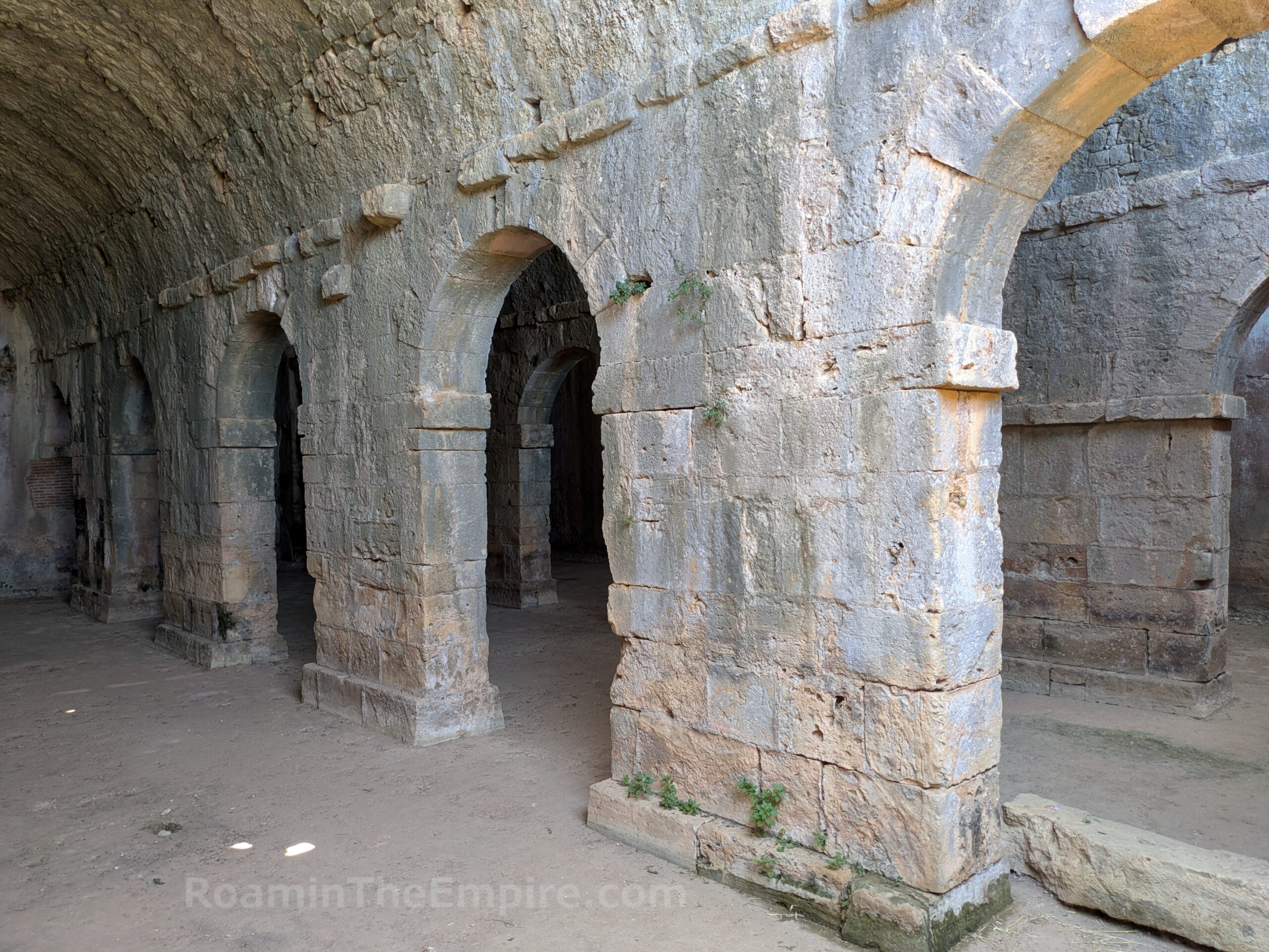 The cisterns that supplied the Baths I are located just a few meters from the south end of the bathing complex, though the remnants of that part of the baths are sparse. These covered cisterns are perhaps the main attraction of the site, with the vaulted roofs of the three chambers still mostly intact. The cisterns seem to date from perhaps as early as the 3rd century BCE originally, with later embellishments and repairs being made in the early Roman period. The capacity of these cisterns is estimated to have been about 2,900 cubic meters. Elements of the channel from which water was drawn are visible in the easternmost part of the cisterns.