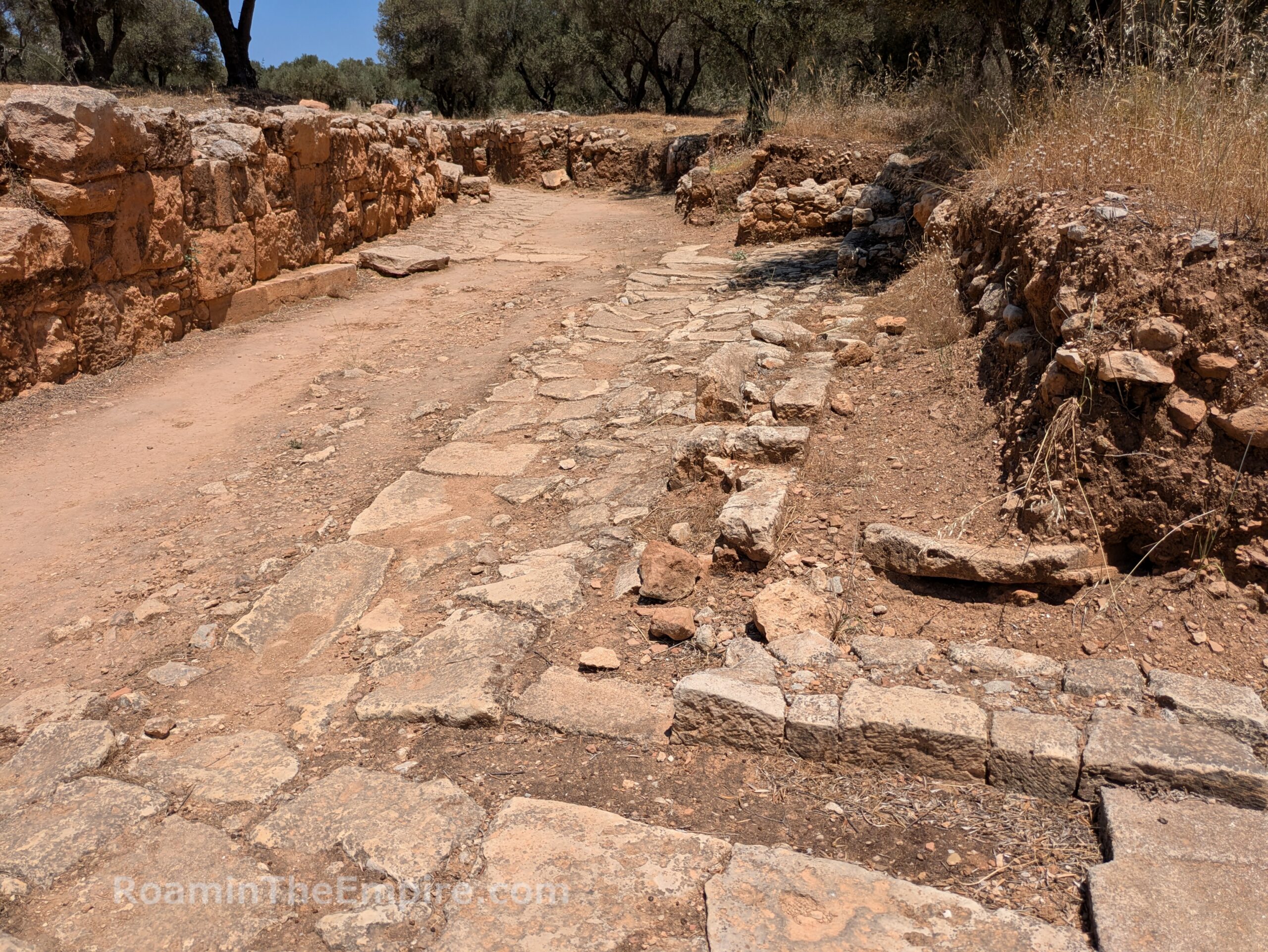 A road and a drainage channel dating to the Hellenistic period run up the slope and through the west parados of the theater. Outside of the east parados of the theater, another Hellenistic road runs along the ancient retaining wall along that side of the theater. This seems to be the same road that is visible near the two room temple. Just outside the east parados, along the east side of the Hellenistic road are some sparse foundations walls of a Hellenistic building that lined that side of the road. The function of the building is not known. The Hellenistic road continues along intermittently to the north for about 50 meters before intersecting with the area of the rectilinear theater.