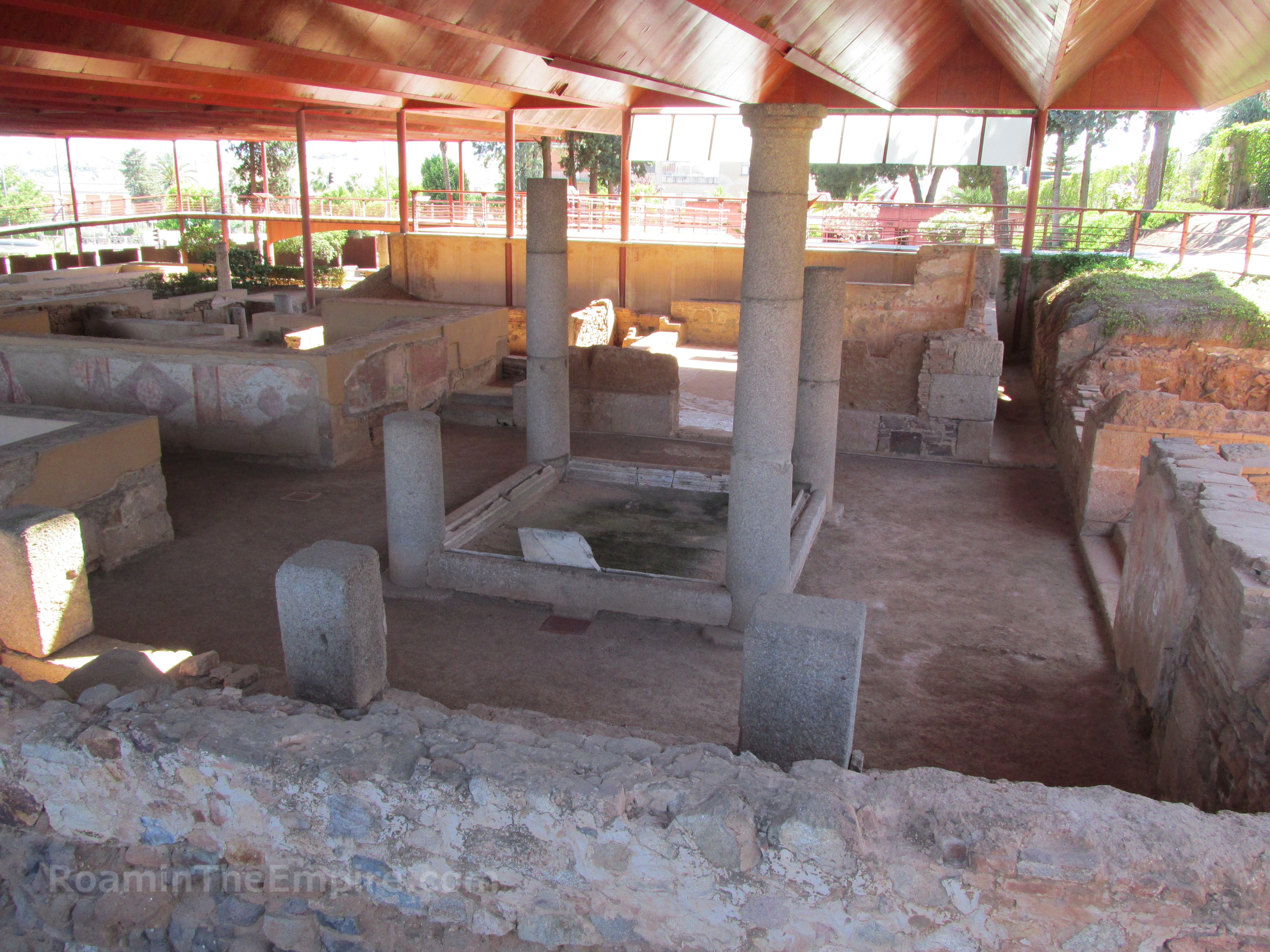 The atrium was also important for the collection of rainwater. Many atria were fitted with two structures, the compluvium and impluvium. The roof around the room would typically be angled inward toward the opening, allowing for the funneling of rainwater on the roof toward this opening. This angle would either funnel the rain water directly down through the opening, or would collect it in a series of rain gutters lining the interior of the open space. This entire roof structure of the atrium was called the compluvium (plural: compluvia), from the Latin cum and pluit, with the rain. This collected water was then funneled down or directed down into a structure below the compluvium called the impluvium (plural: impluvia), from the Latin impluit, to rain upon. The area directly under the open space would be a collection basin for the rain the fell through or was directed into the opening. If the rain was funneled via rain gutters, a pipe would bring the water down into this area. The water would then be drained into a cistern beneath the impluvium for later use. The evaporation of water from the cistern combined with the air circulation coming in from the skylight would also serve as a sort of evaporative cooling mechanism for the house.