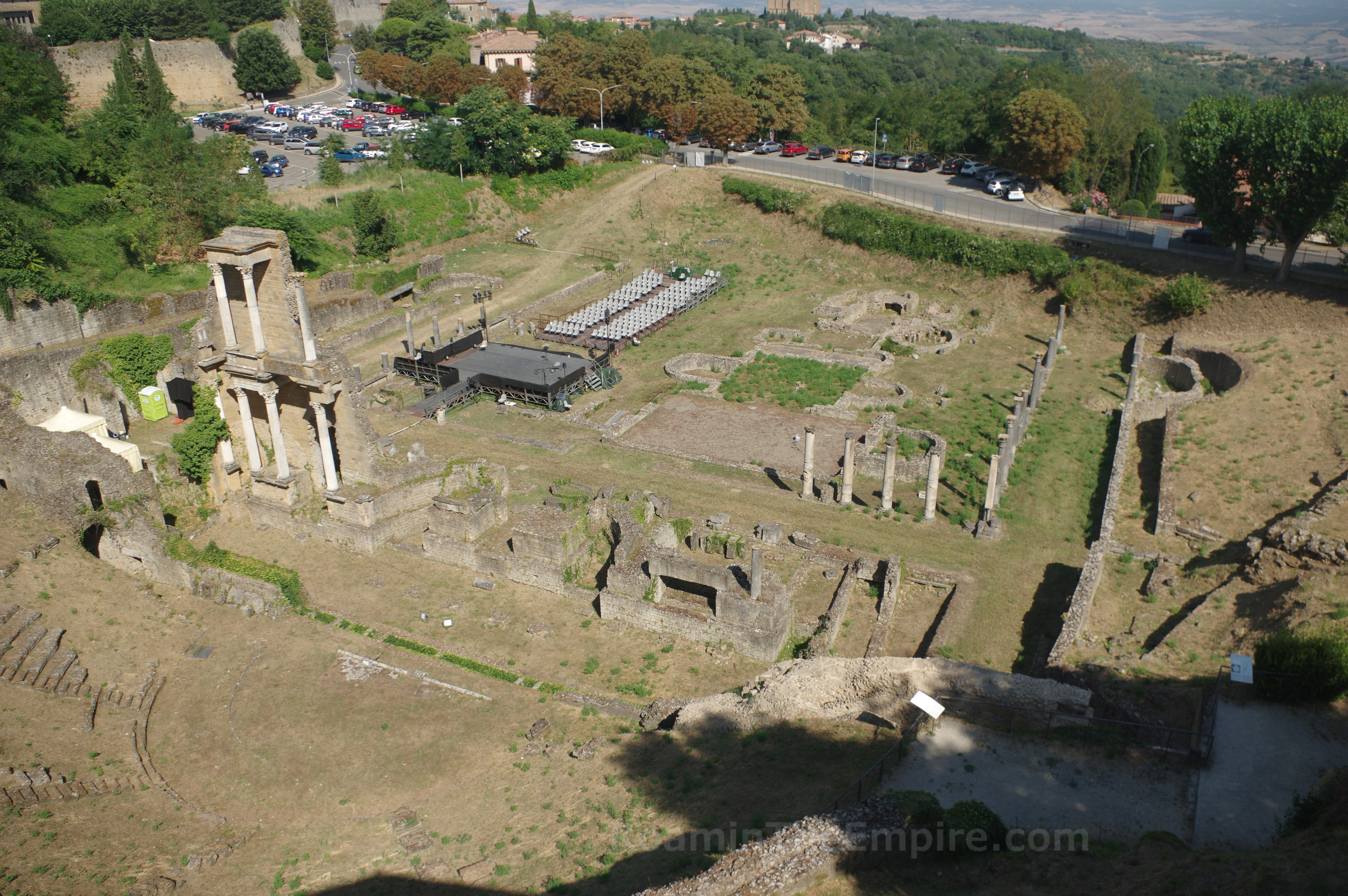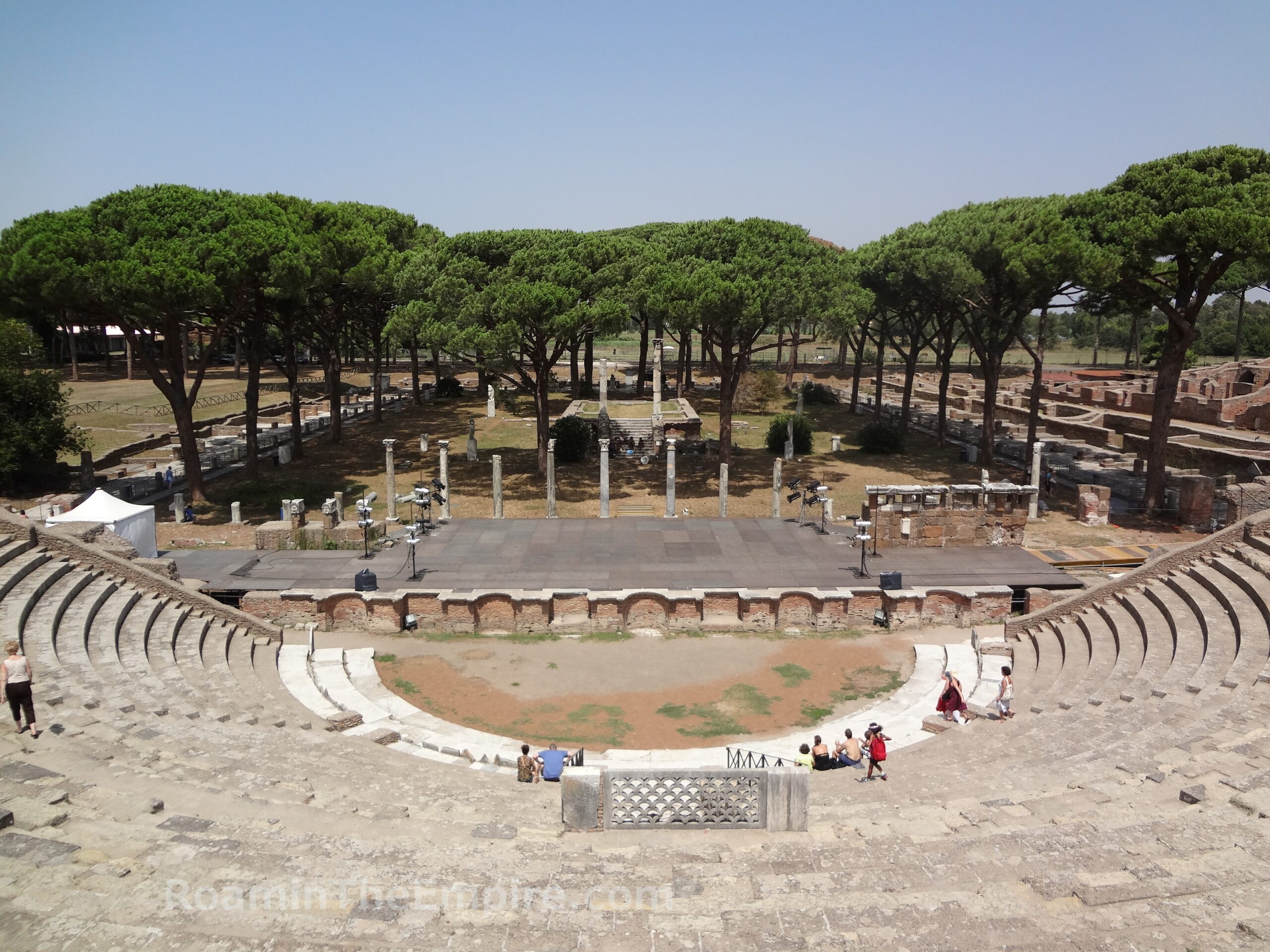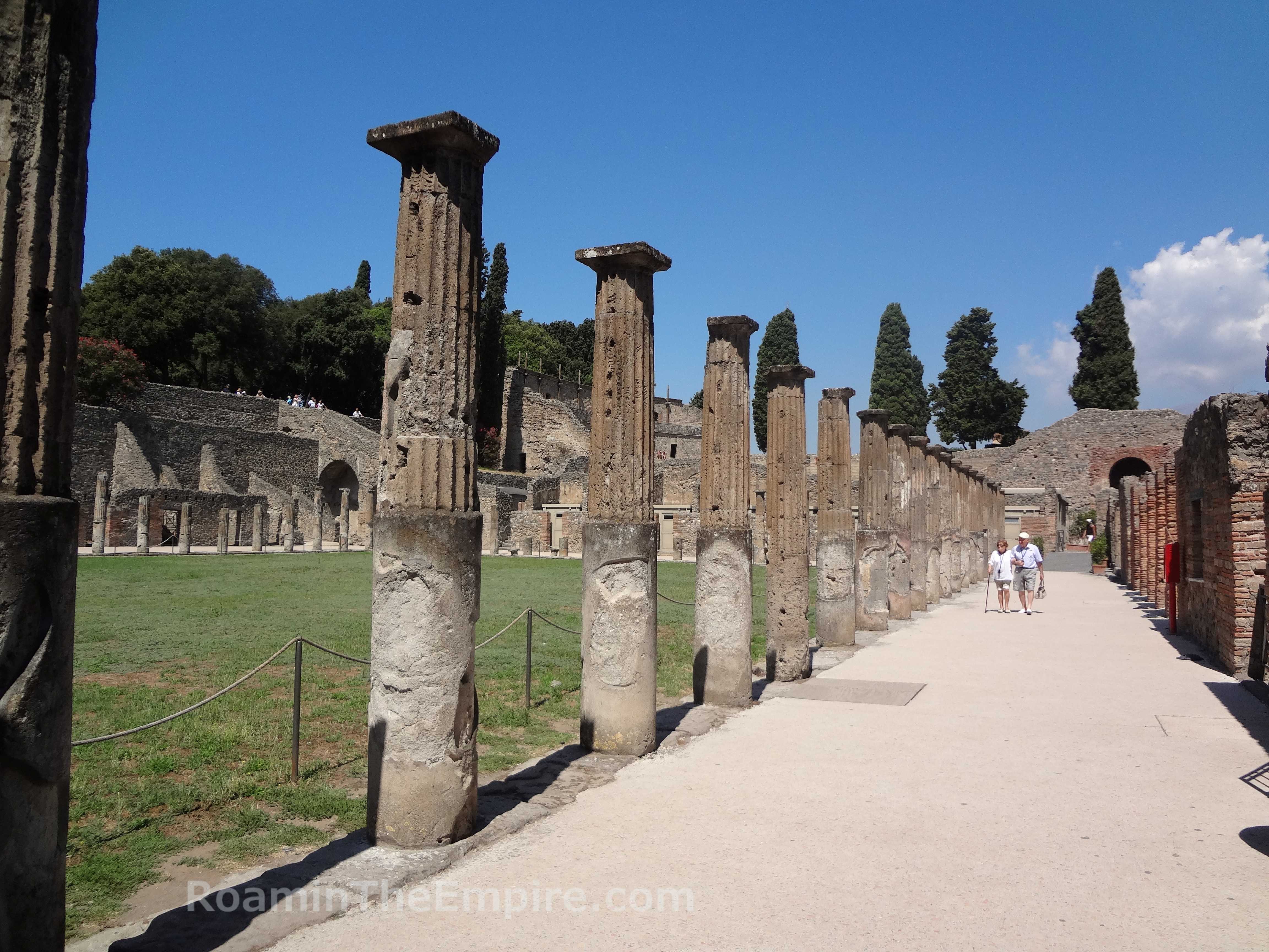 A quadriporticus (plural: quadriporticus) was a square/rectangular courtyard area surrounded on four sides by porticoes. The name is derived from the Latin four, quattor, and porticus, a colonnaded and covered walkway. The shape and layout is reminiscent of the Greek and Roman palaestrae. While palaestrae have links to exercise and bathing, a quadriporticus typically refers to this type of monumental structure used outside of a bathing complex in the Roman world, though it may still have links to athletic endeavors. Quadriporticus often seem to be built in conjunction with a theater, with several of the buildings being found constructed to the rear of a theater. The quadriporticus differs from a peristyle in that while they may both incorporate a four sided portico, the peristyle is specifically an interior courtyard in a larger building, while the quadriporticus is the building itself (though it may be part of a larger building complex).